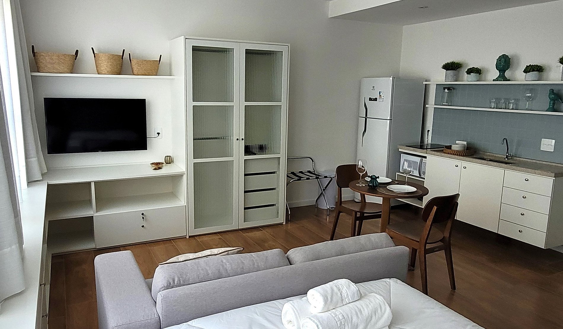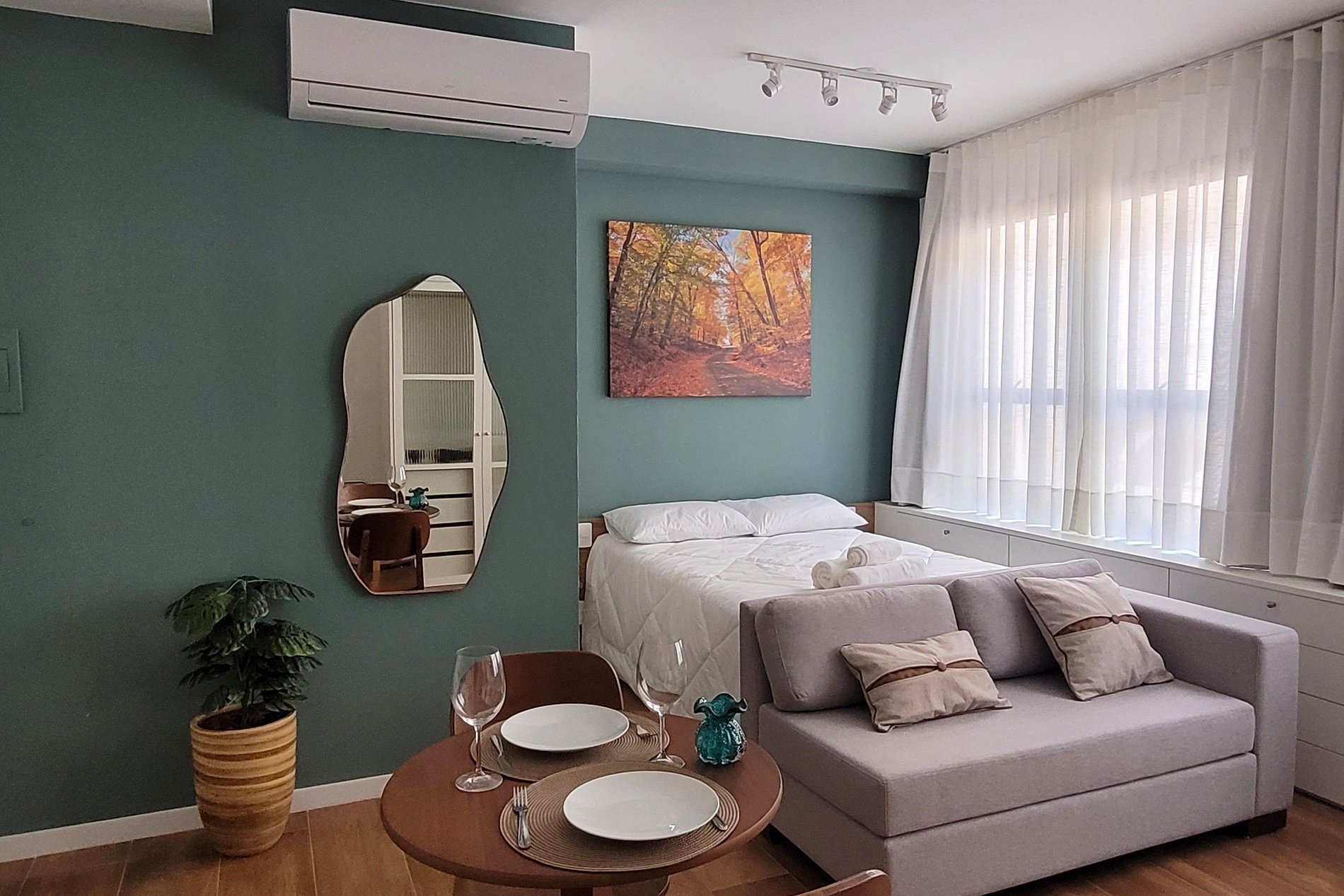 Flat aconchegante e decorado, com uma cama de casal, banheiro privativo, cozinha.