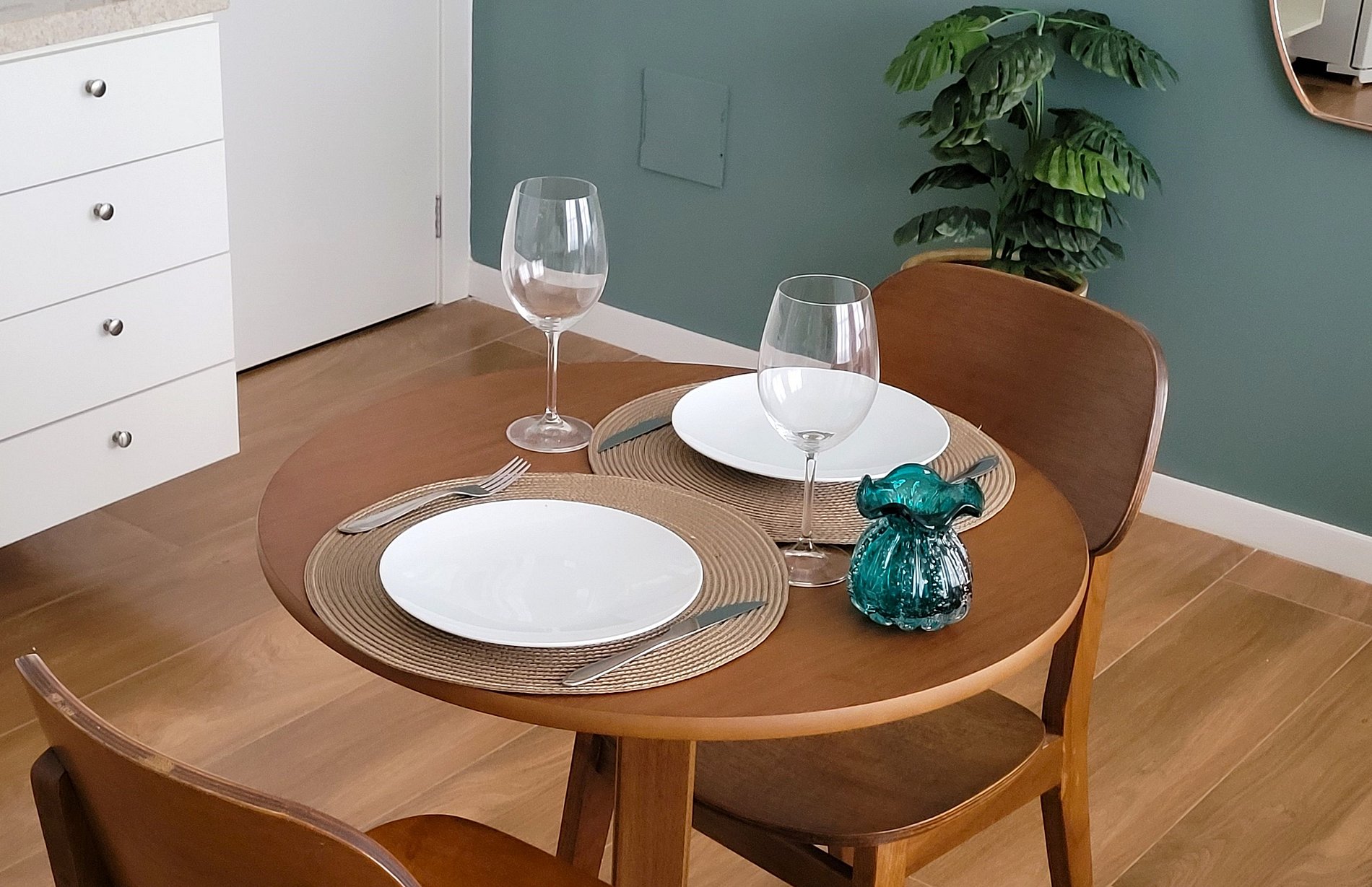 - Cozinha equipada com fogão de indução, micro-ondas, geladeira, pratos, talheres, copos