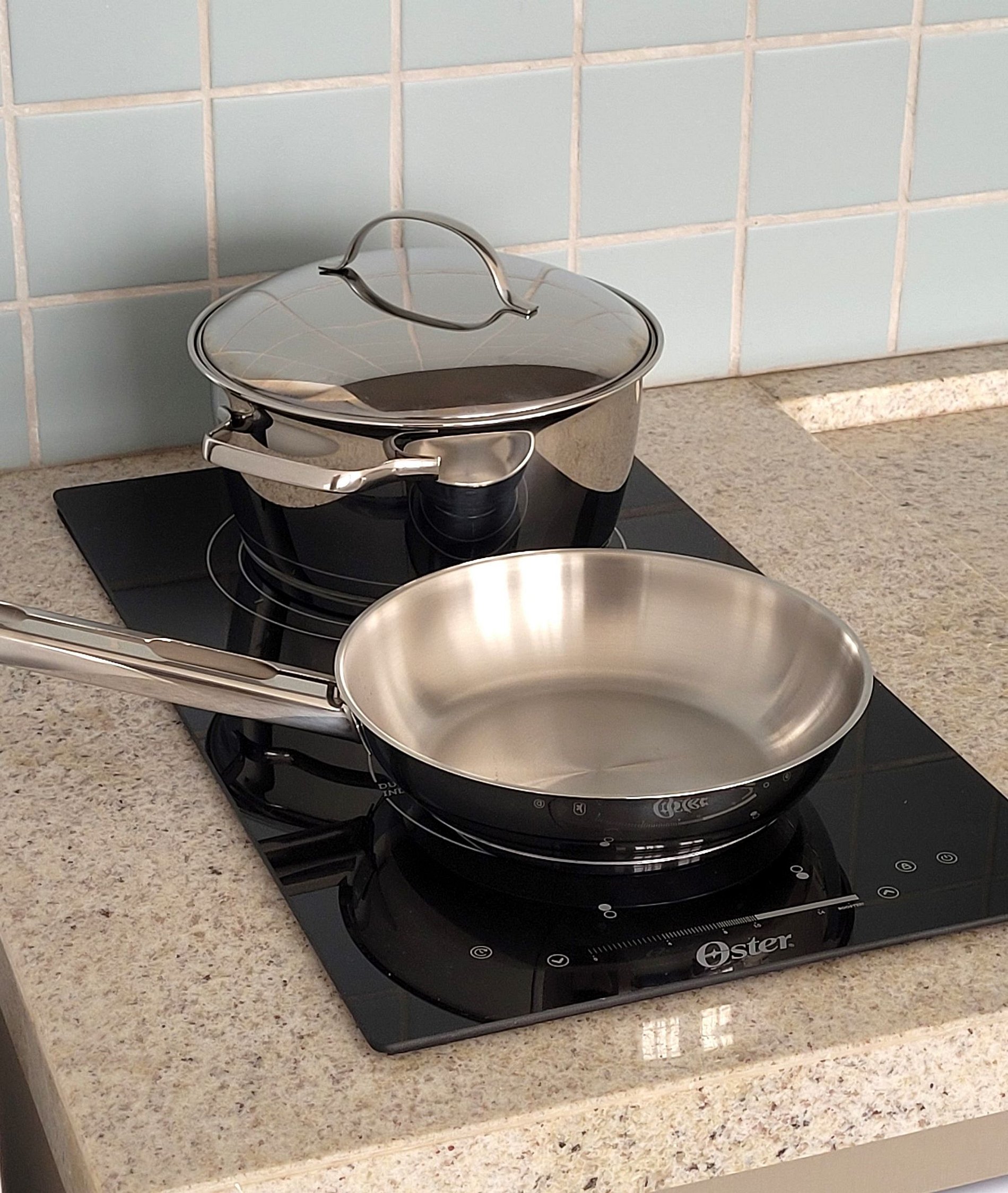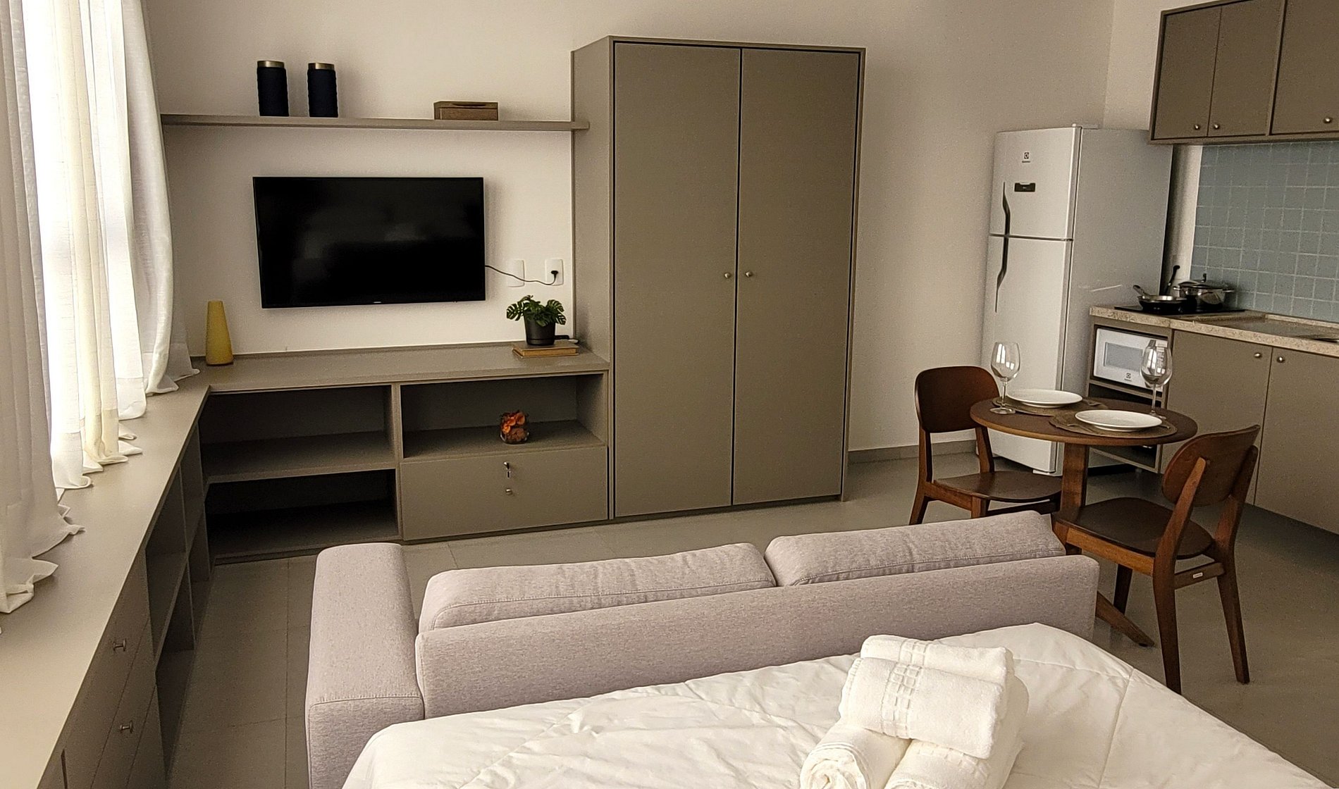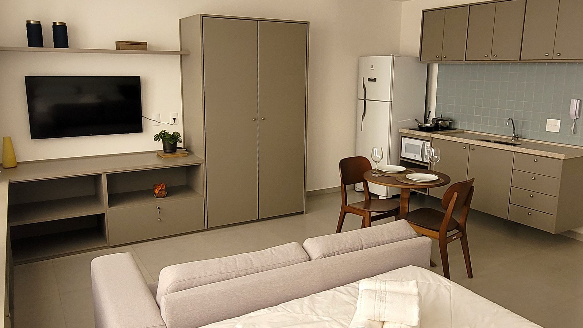 - Cozinha equipada com fogão de indução, micro-ondas, geladeira, pratos, talheres, copos