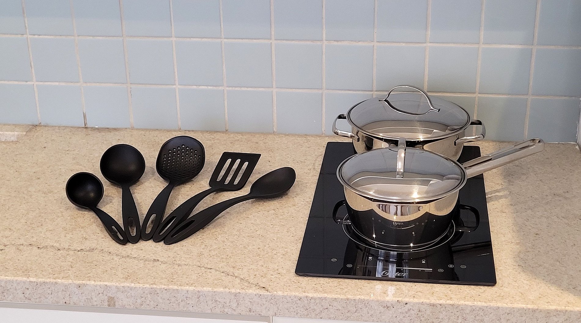 - Cozinha equipada com fogão de indução, micro-ondas, geladeira, pratos, talheres, copos