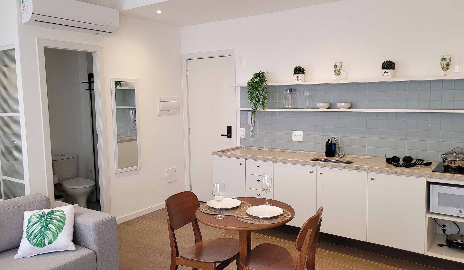 - Cozinha equipada com fogão de indução, micro-ondas, geladeira, pratos, talheres, copos