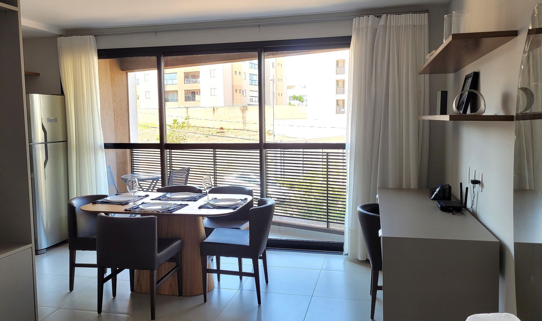 - Cozinha equipada com fogão de indução, micro-ondas, geladeira, pratos, talheres, copos