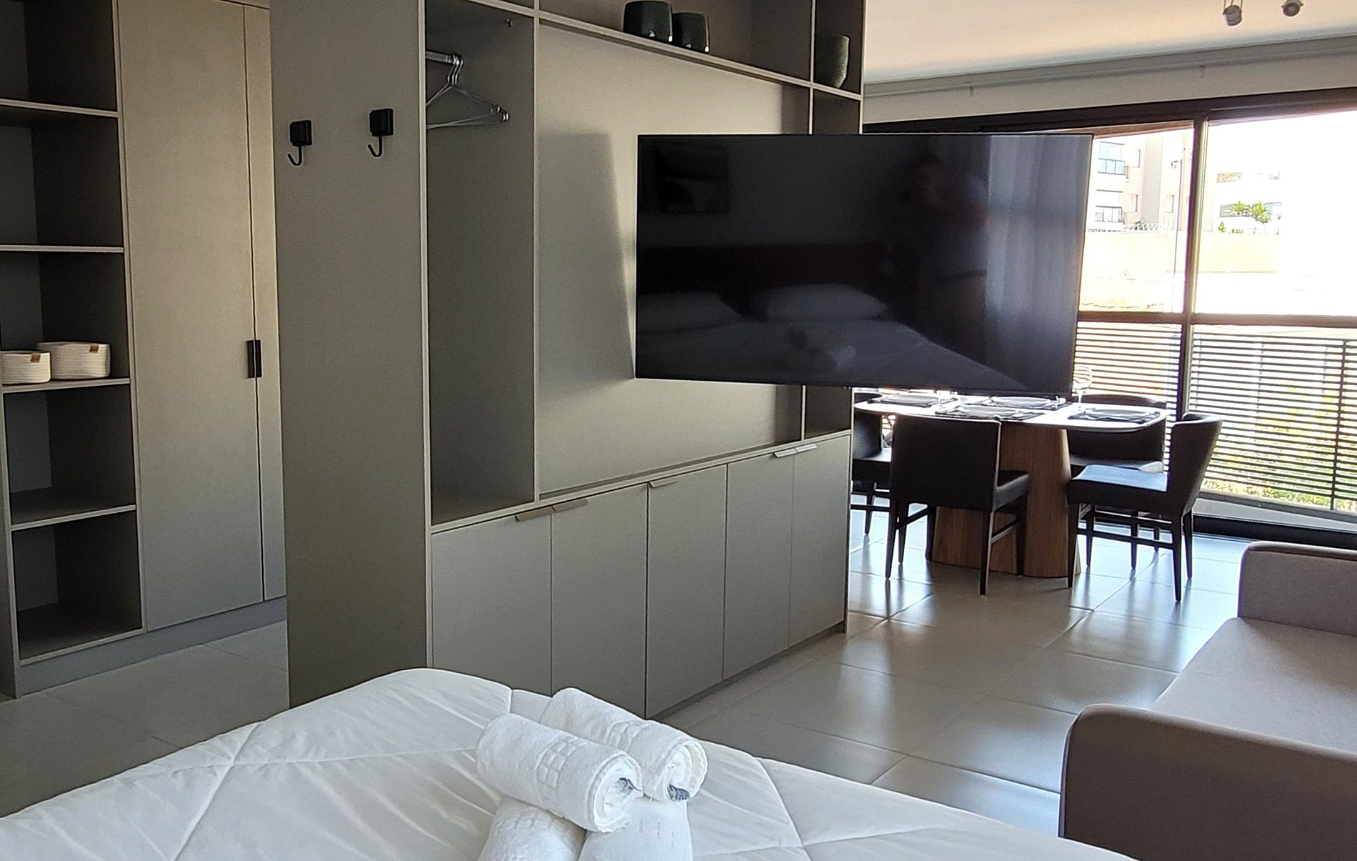 O check-in virtual precisa ser feito antecipadamente para acesso ao prédio e ao apartamento. ACESSO AO PRÉDIO: Reconhecimento Facial. ACESSO AO STUDIO: Senha