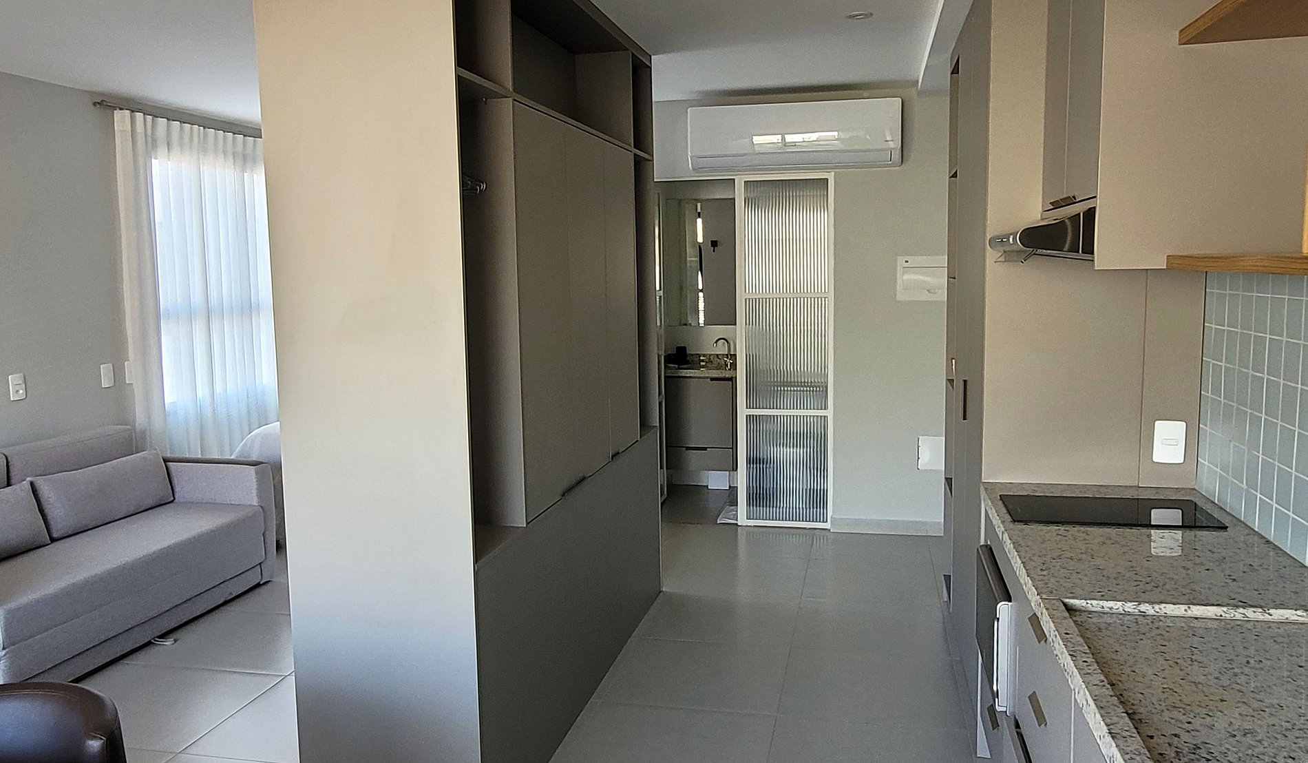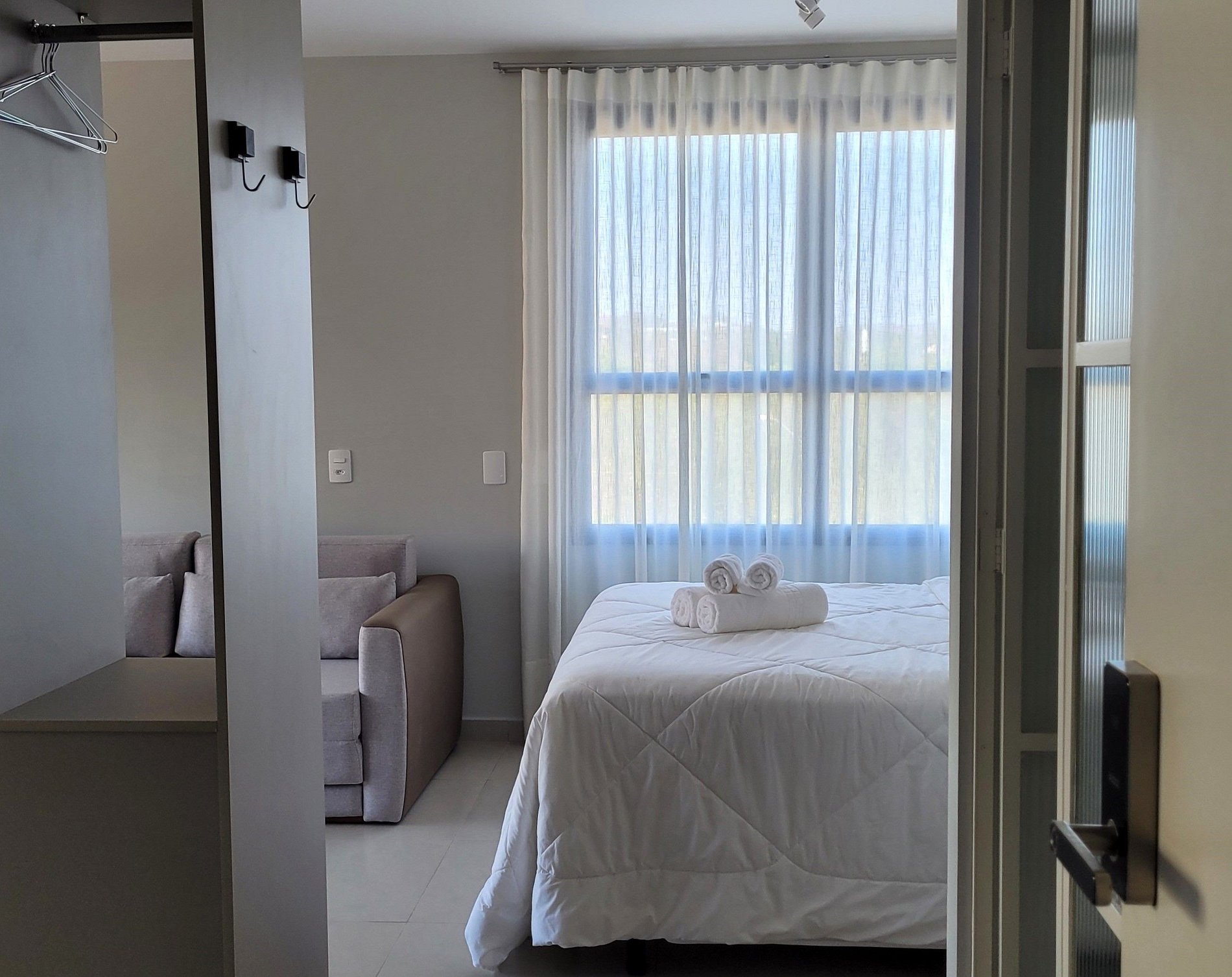 O check-in virtual precisa ser feito antecipadamente para acesso ao prédio e ao apartamento. ACESSO AO PRÉDIO: Reconhecimento Facial. ACESSO AO STUDIO: Senha