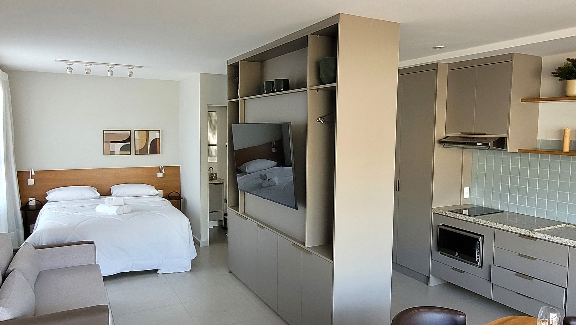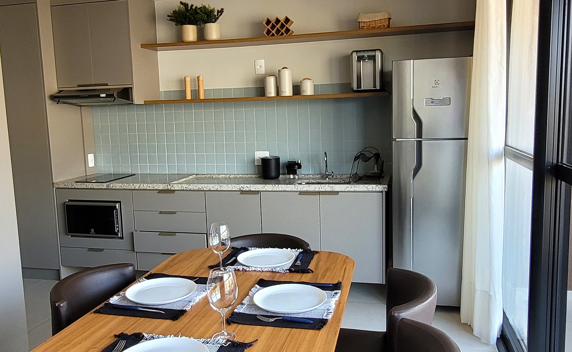 - Cozinha equipada com fogão de indução, micro-ondas, geladeira, pratos, talheres, copos