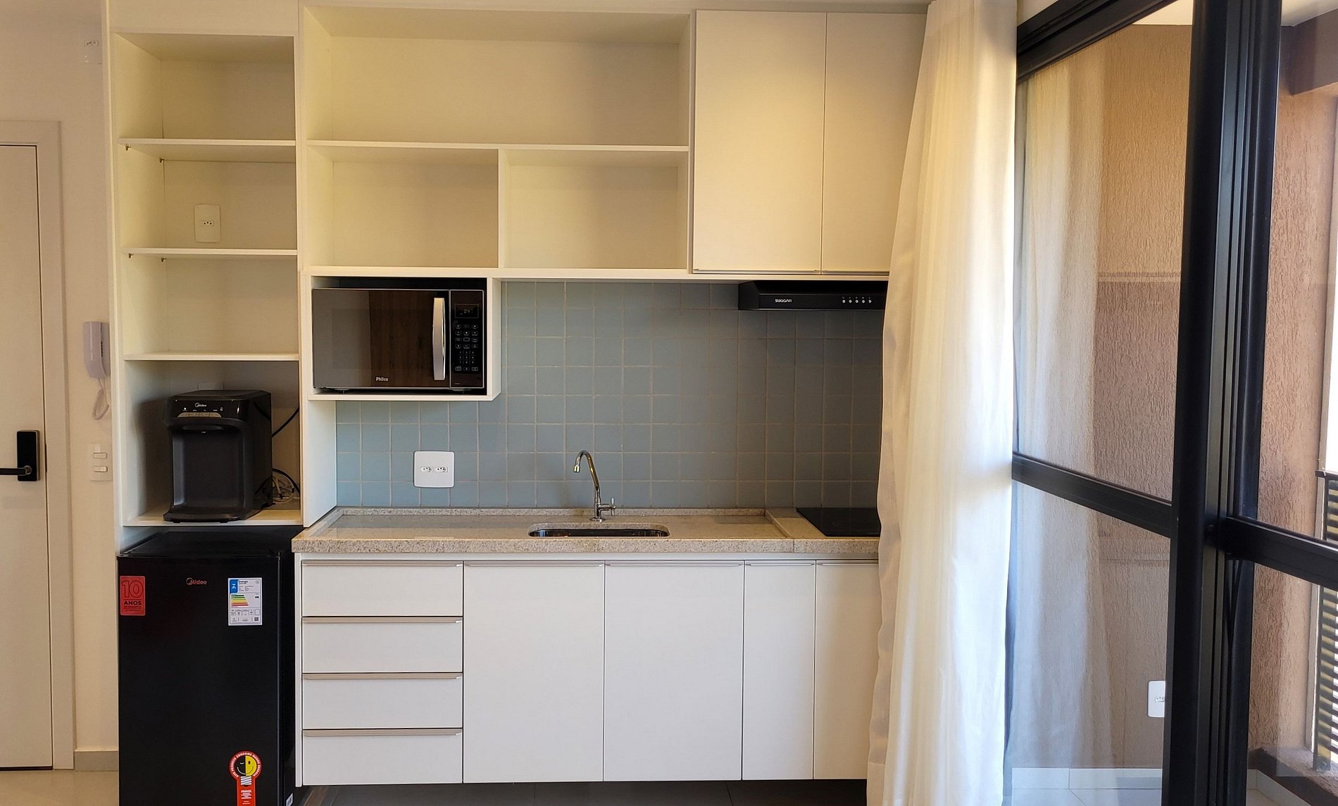 - Cozinha equipada com fogão de indução, micro-ondas, geladeira, pratos, talheres, copos