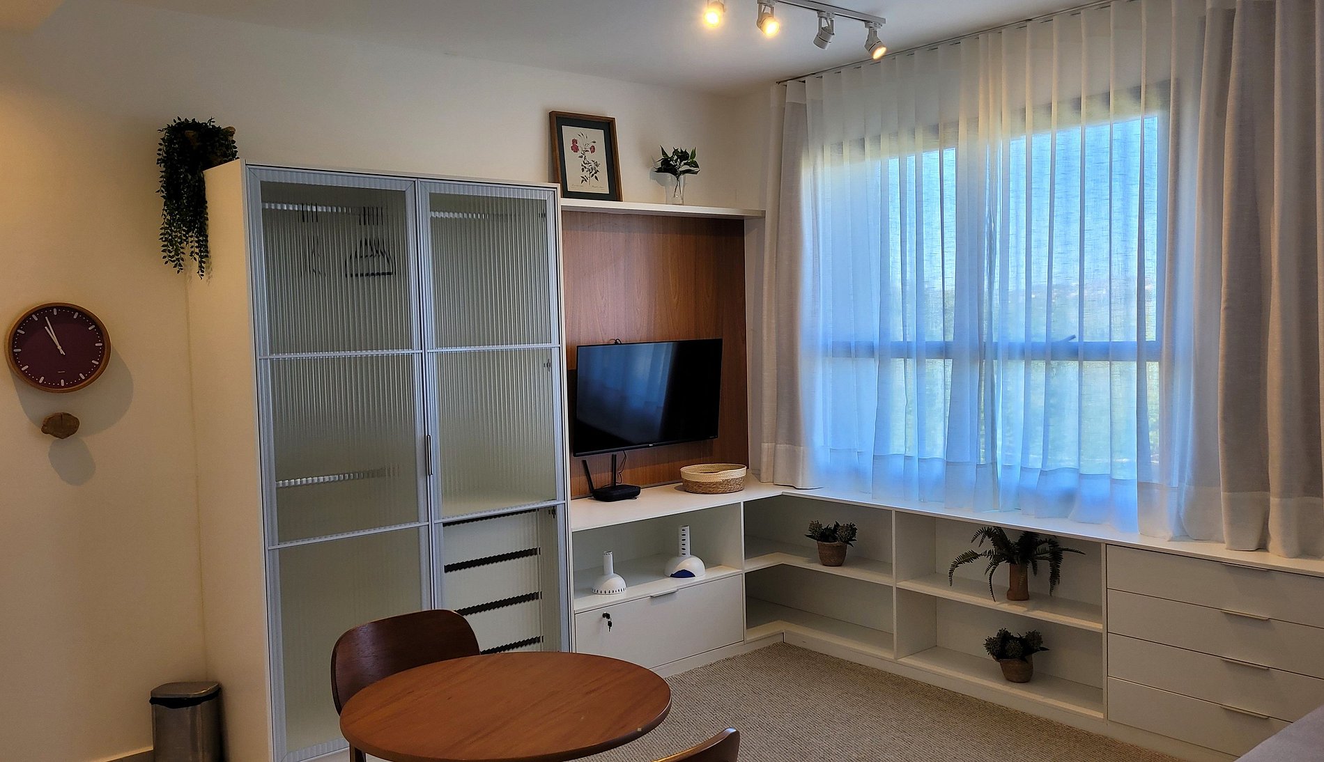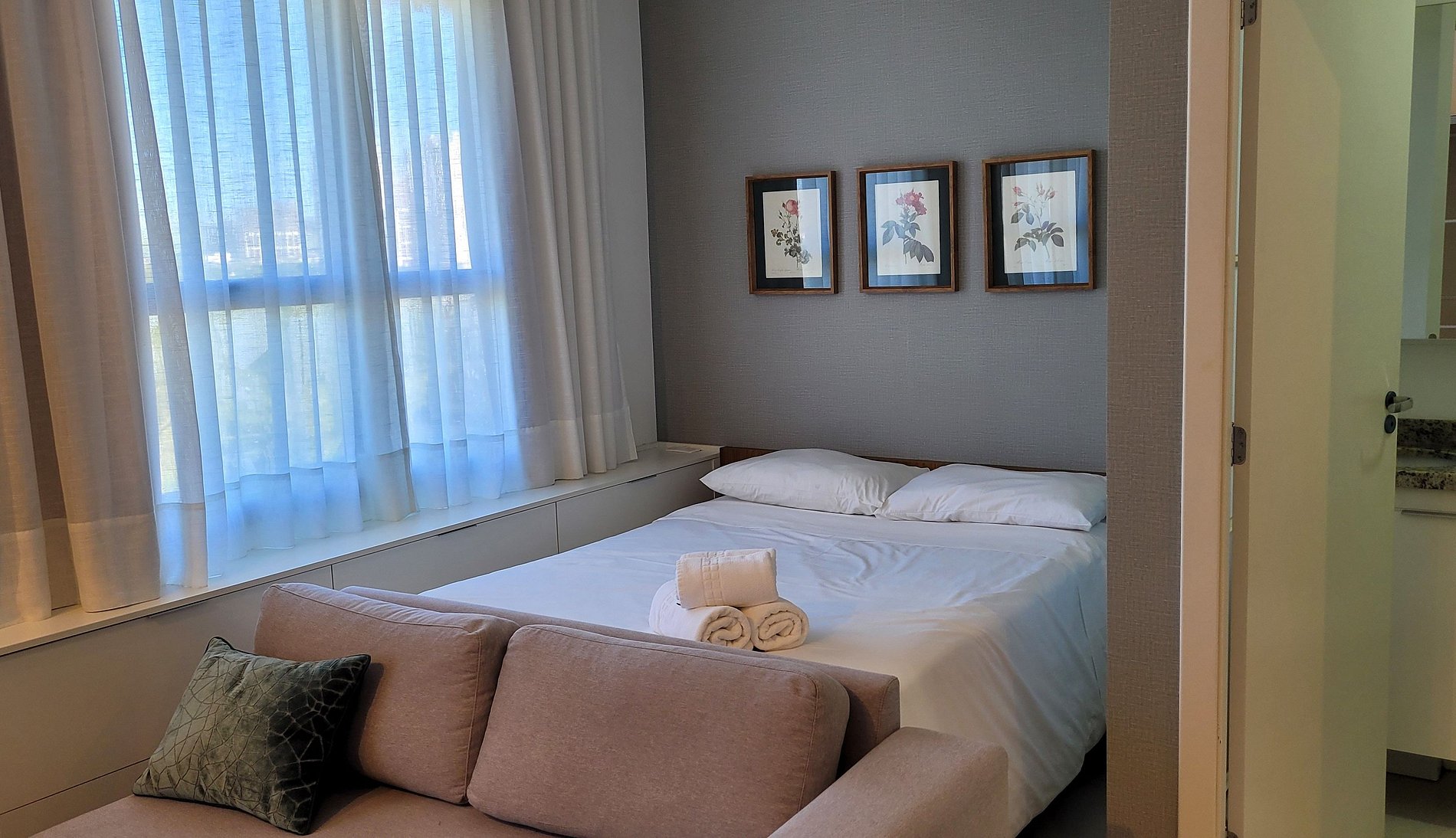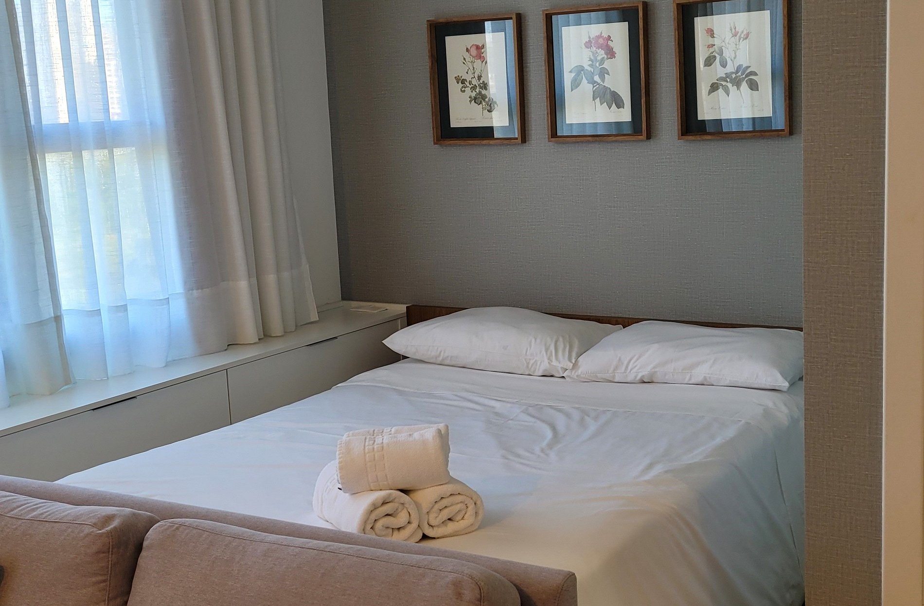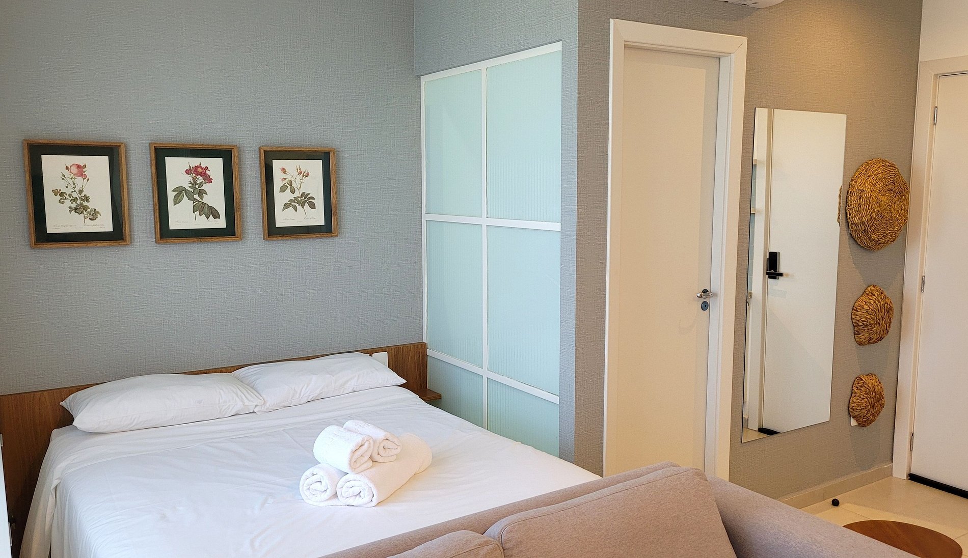 Flat aconchegante e decorado, com uma cama de casal, banheiro privativo, cozinha.