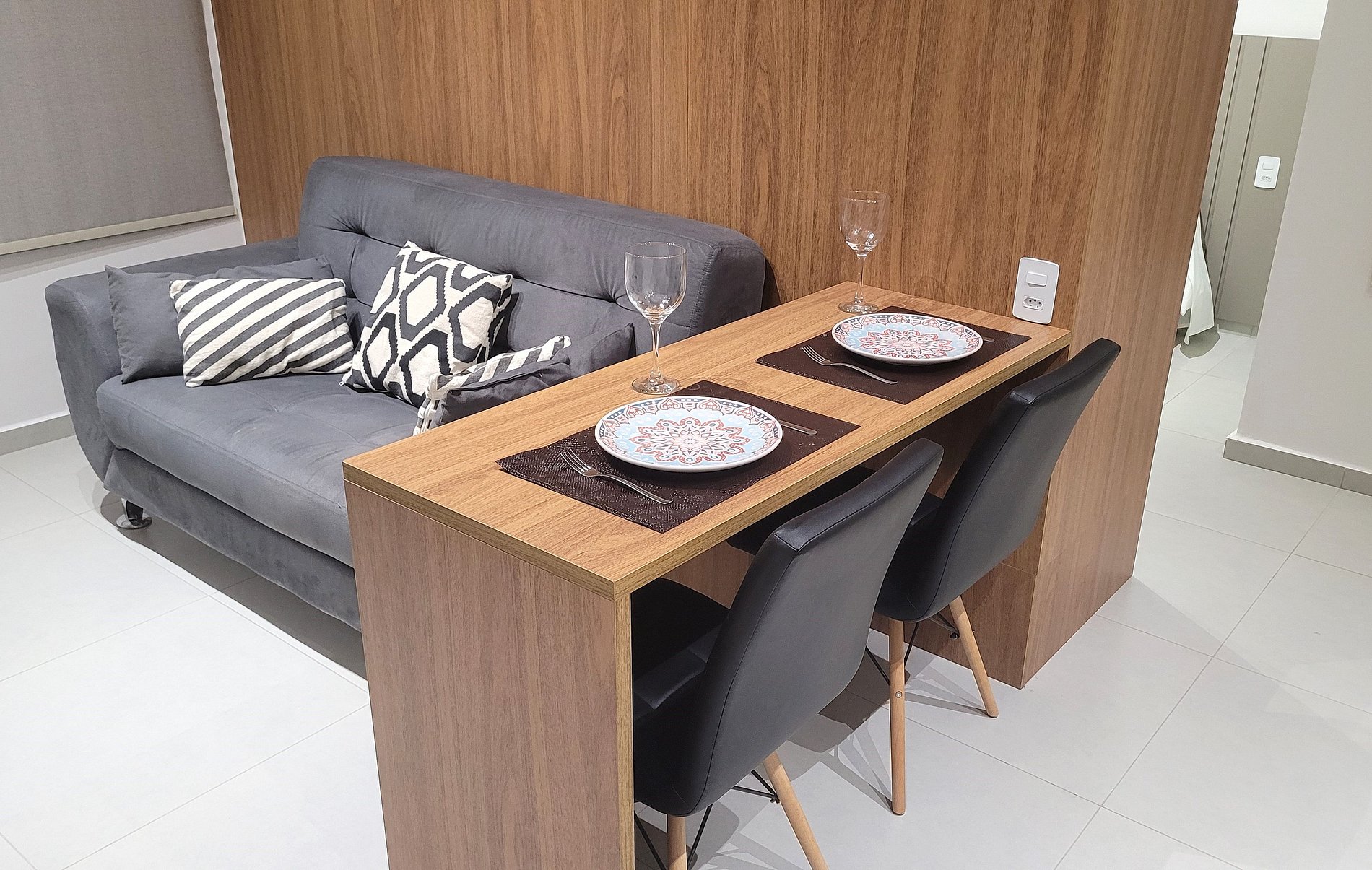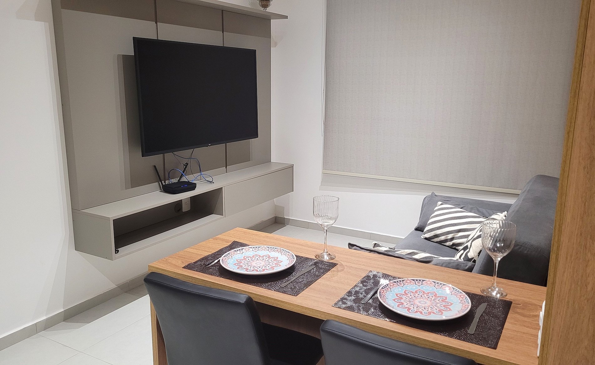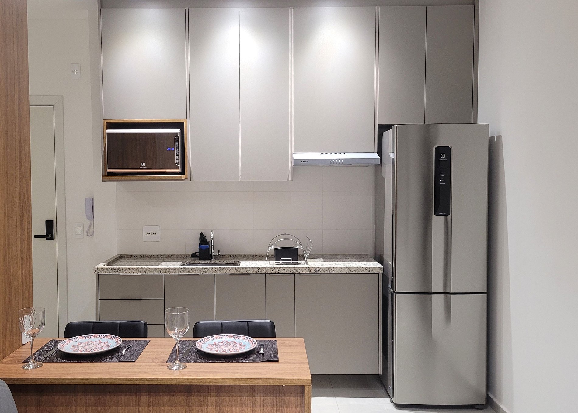 - Cozinha equipada com fogão de indução, micro-ondas, geladeira, pratos, talheres, copos