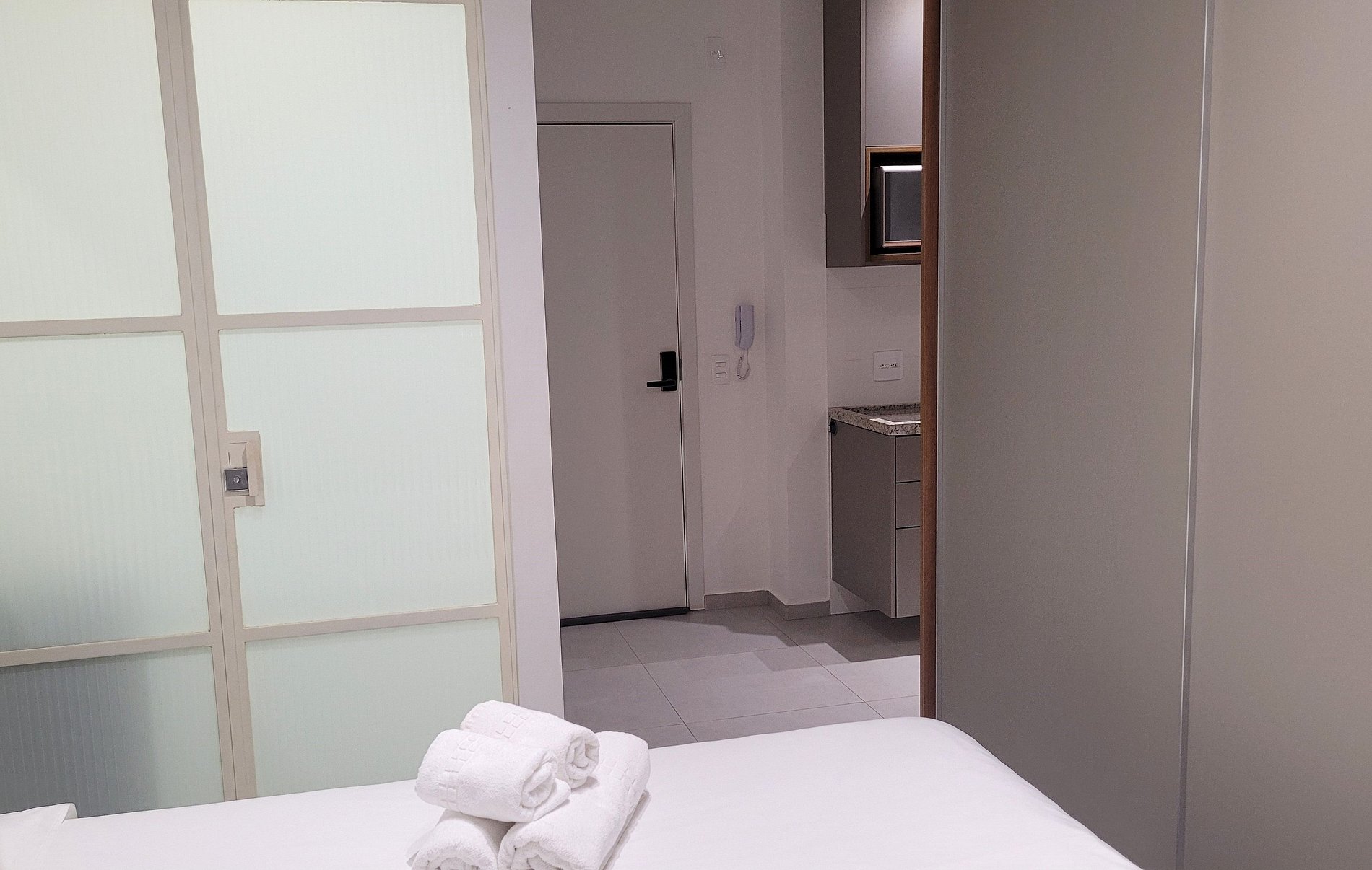 O check-in virtual precisa ser feito antecipadamente para acesso ao prédio e ao apartamento. ACESSO AO PRÉDIO: Reconhecimento Facial. ACESSO AO STUDIO: Senha