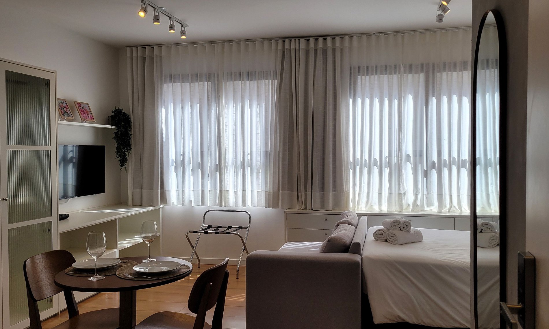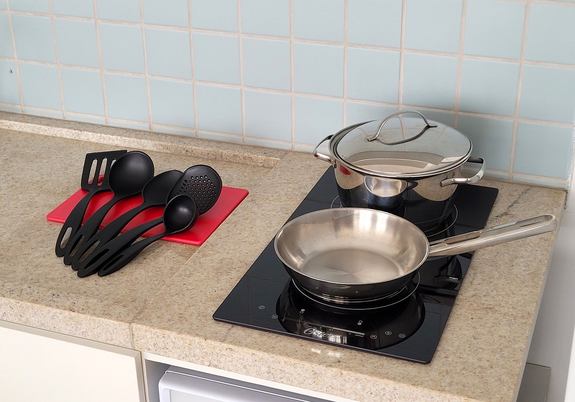 - Cozinha equipada com fogão de indução, micro-ondas, geladeira, pratos, talheres, copos