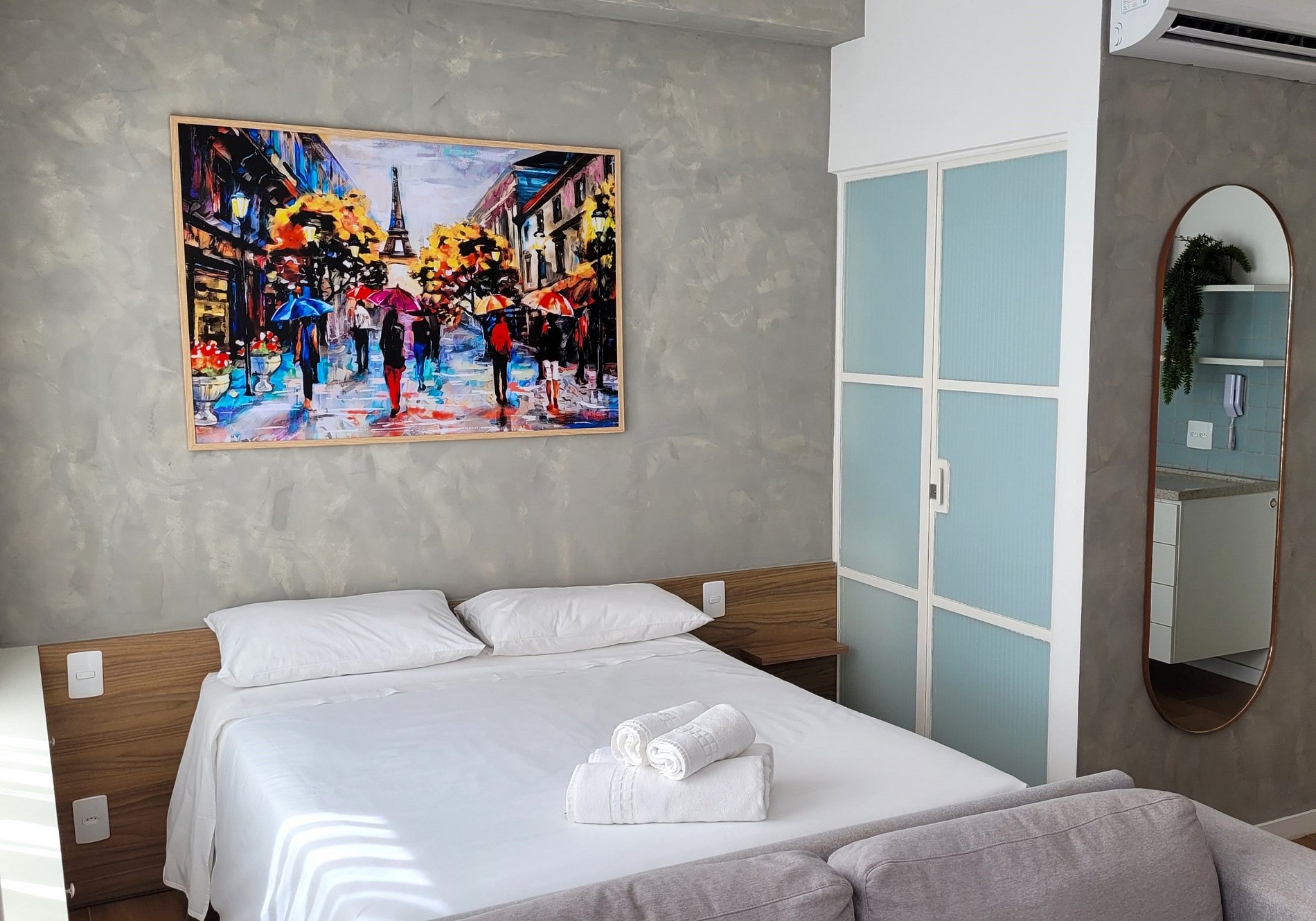Flat aconchegante, com uma cama de casal, banheiro privativo, cozinha.