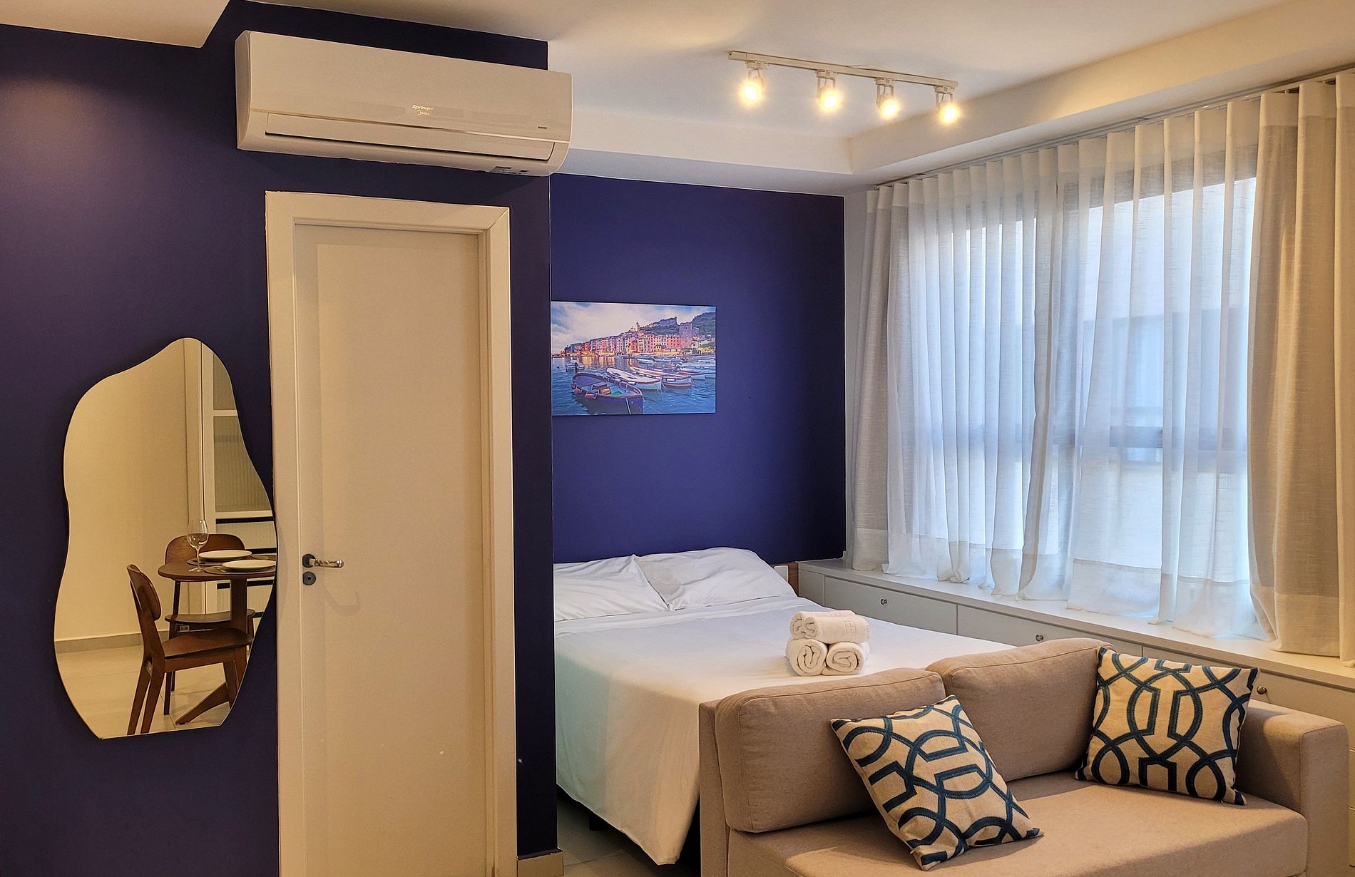 Flat aconchegante, com uma cama de casal, banheiro privativo, cozinha.