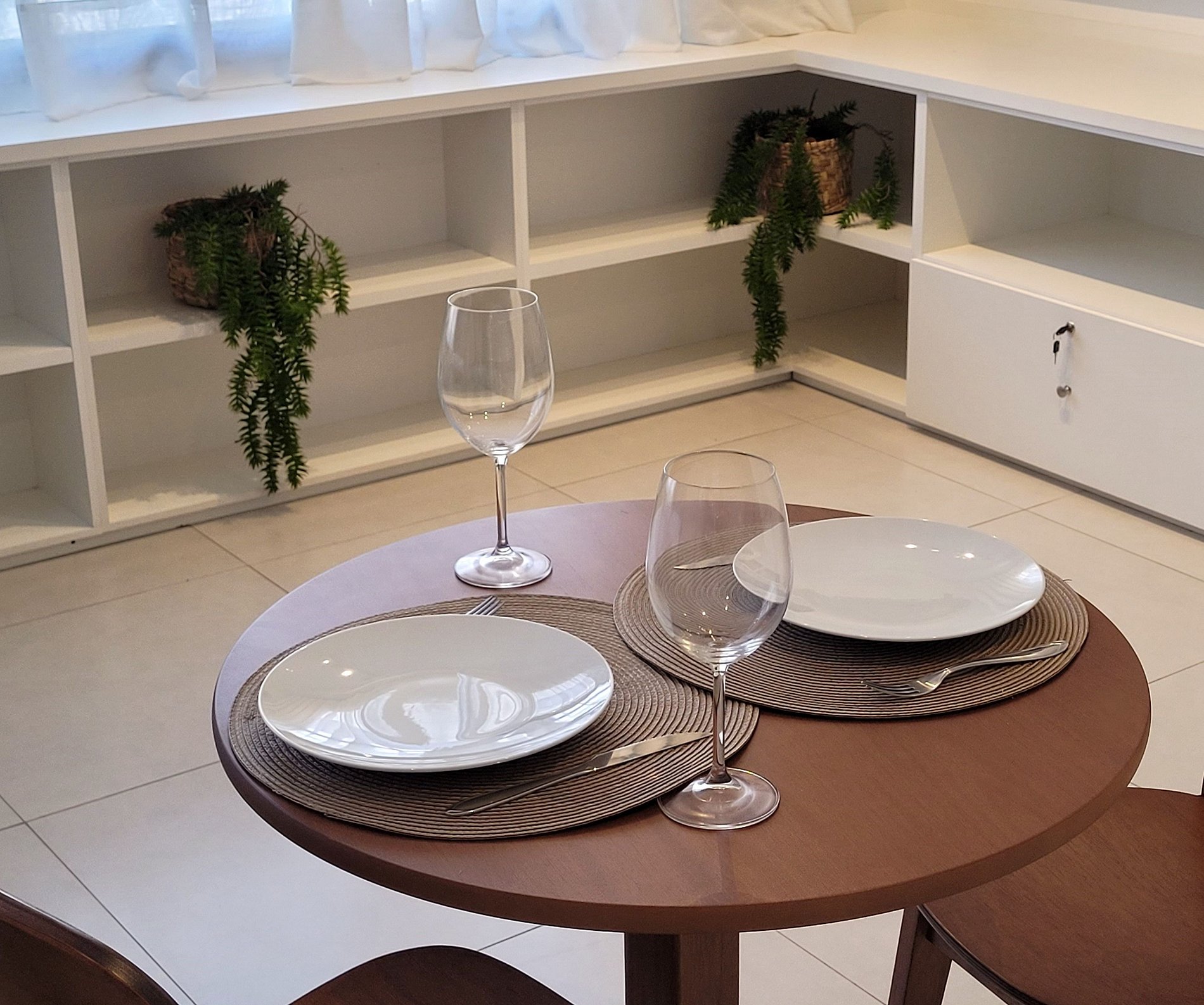- Cozinha equipada com fogão de indução, micro-ondas, geladeira, pratos, talheres, copos