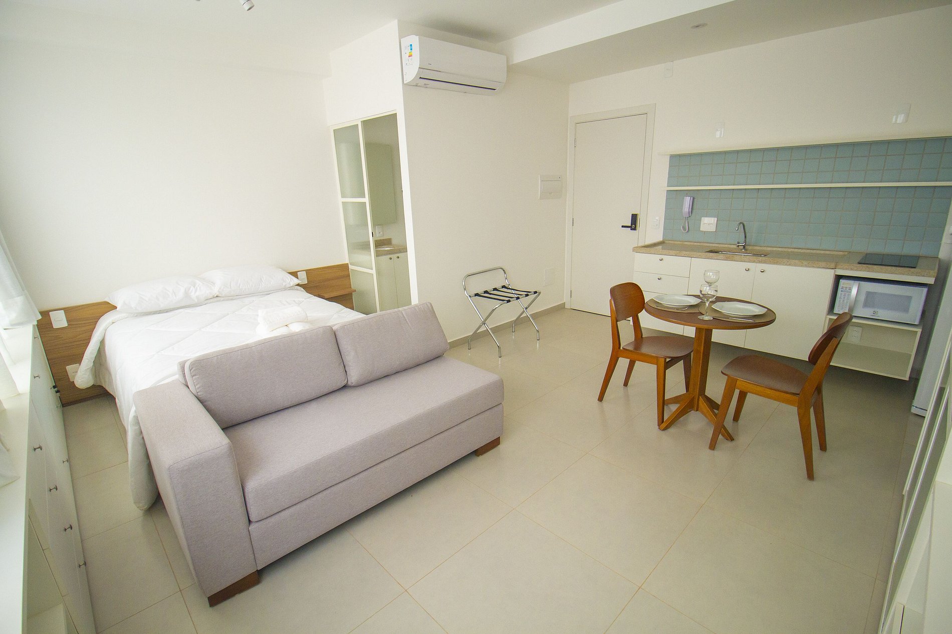 - Cozinha equipada com fogão de indução, micro-ondas, geladeira, pratos, talheres, copos