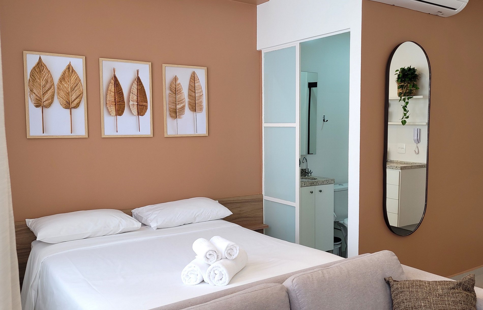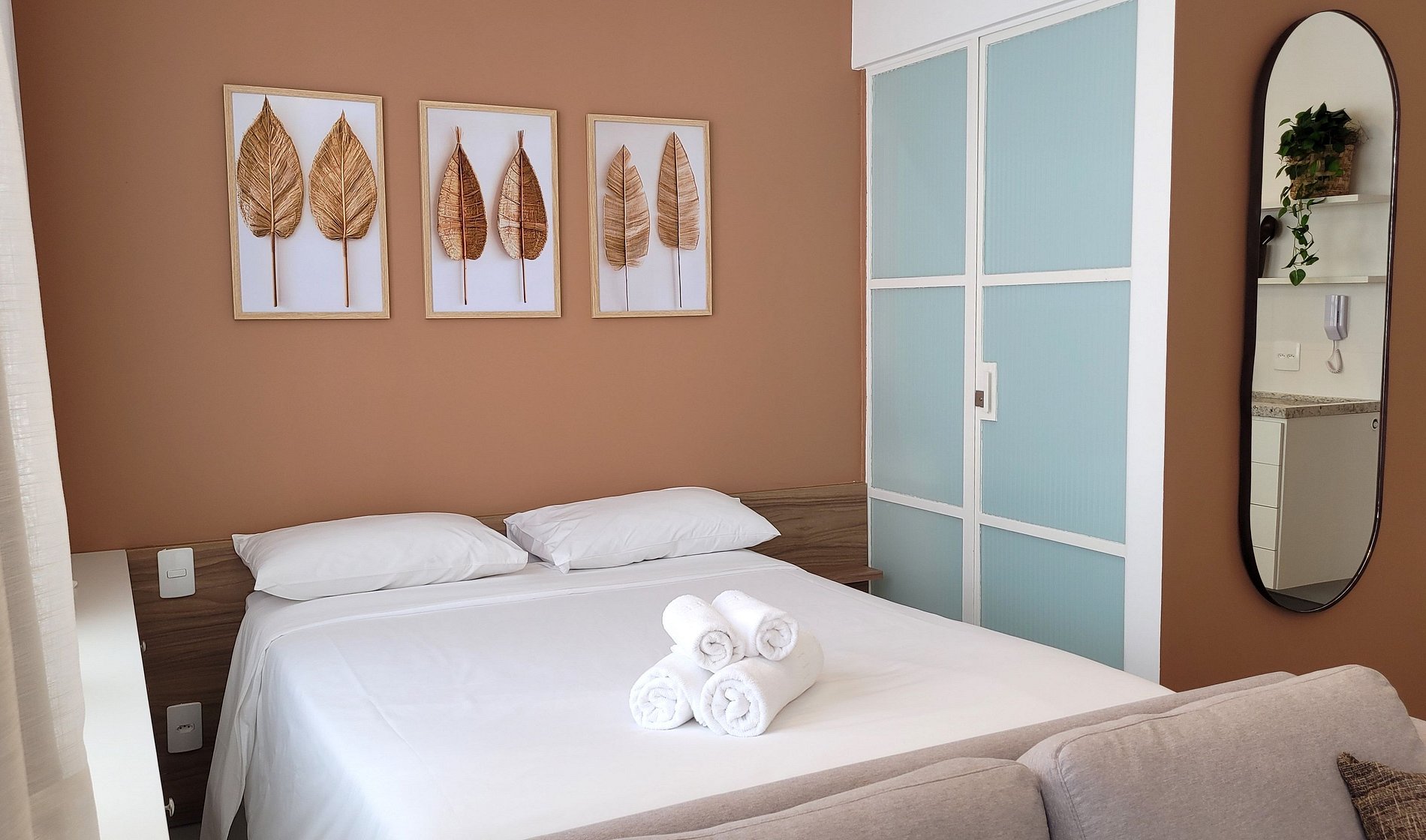Flat aconchegante, com uma cama de casal, banheiro privativo, cozinha.