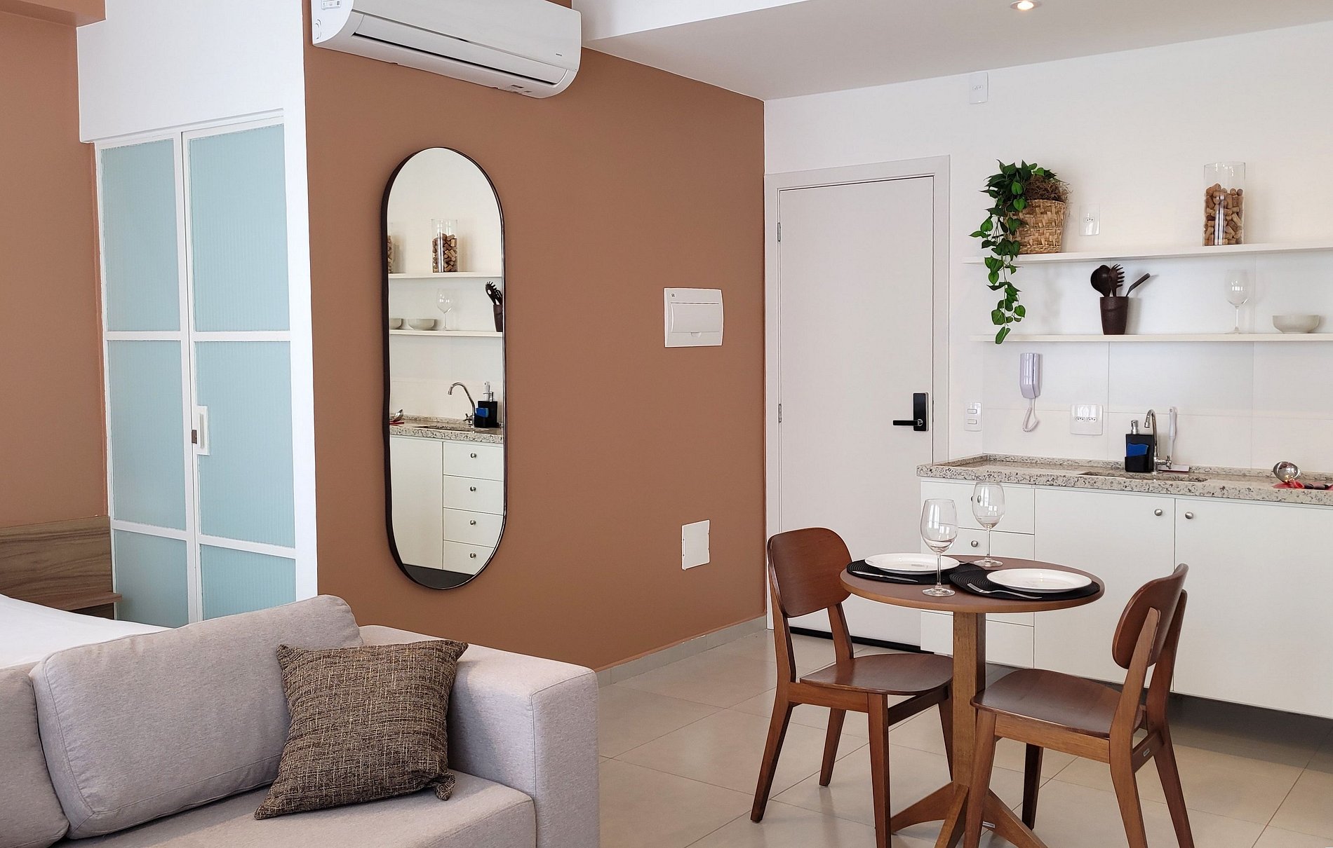 O check-in virtual precisa ser feito antecipadamente para acesso ao prédio e ao apartamento. ACESSO AO PRÉDIO: Reconhecimento Facial. ACESSO AO STUDIO: Senha