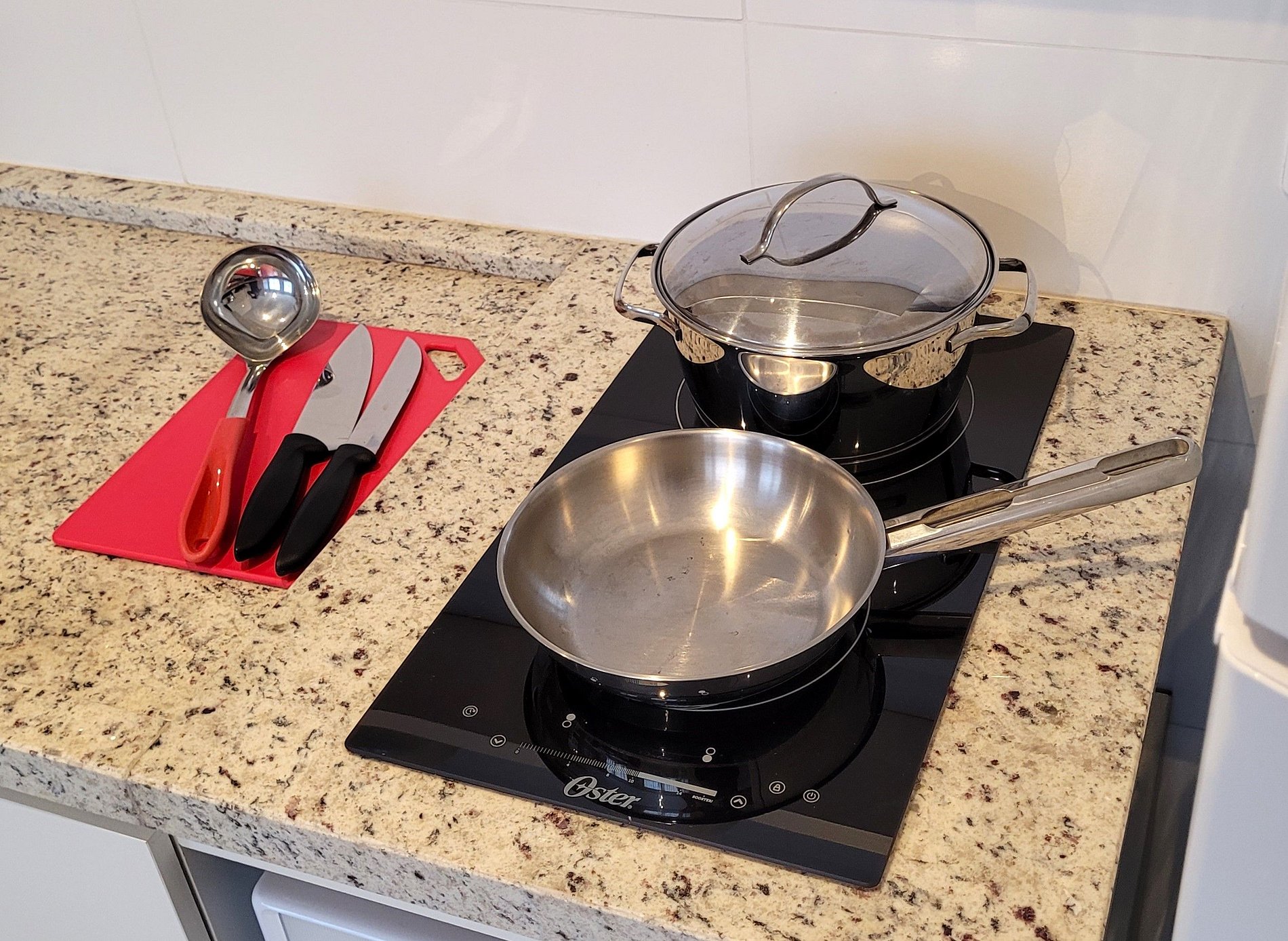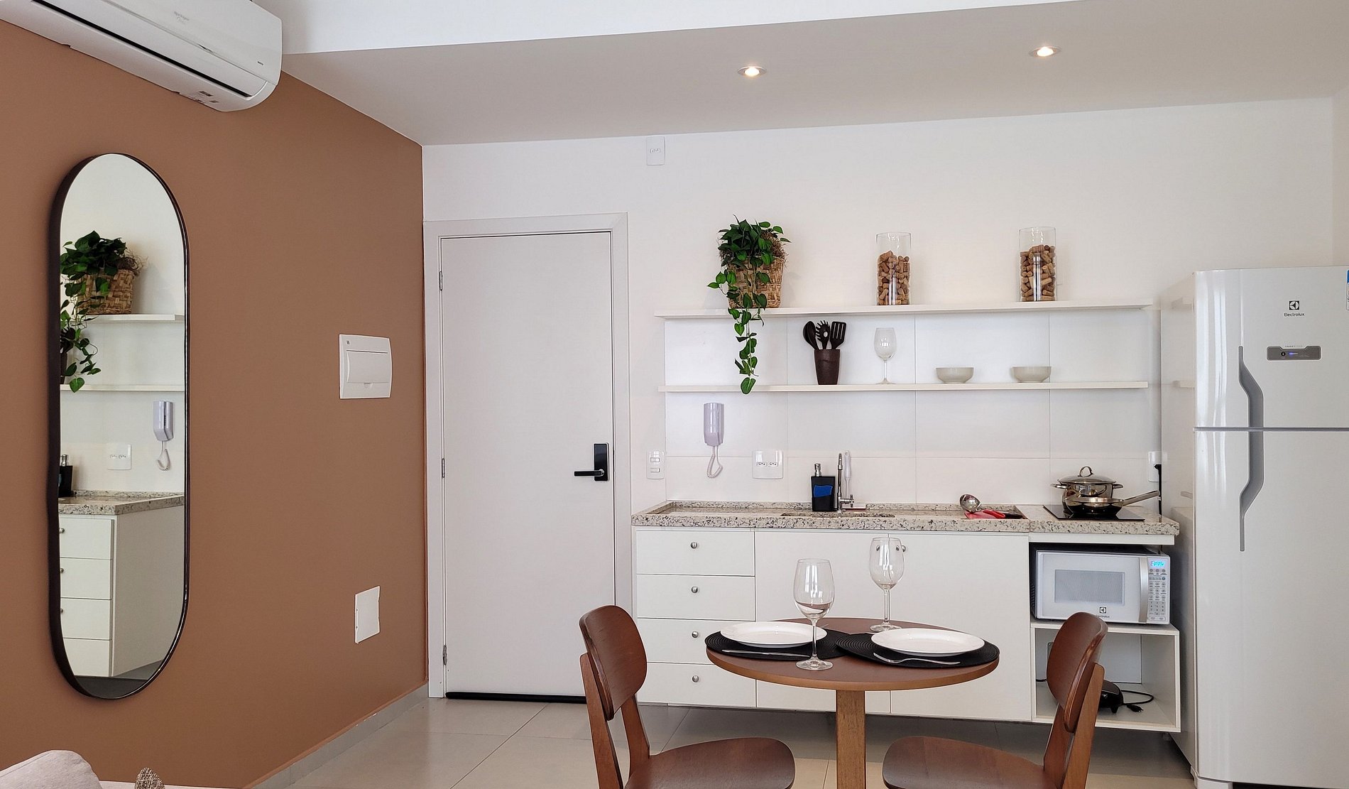 - Cozinha equipada com fogão de indução, micro-ondas, geladeira, pratos, talheres, copos