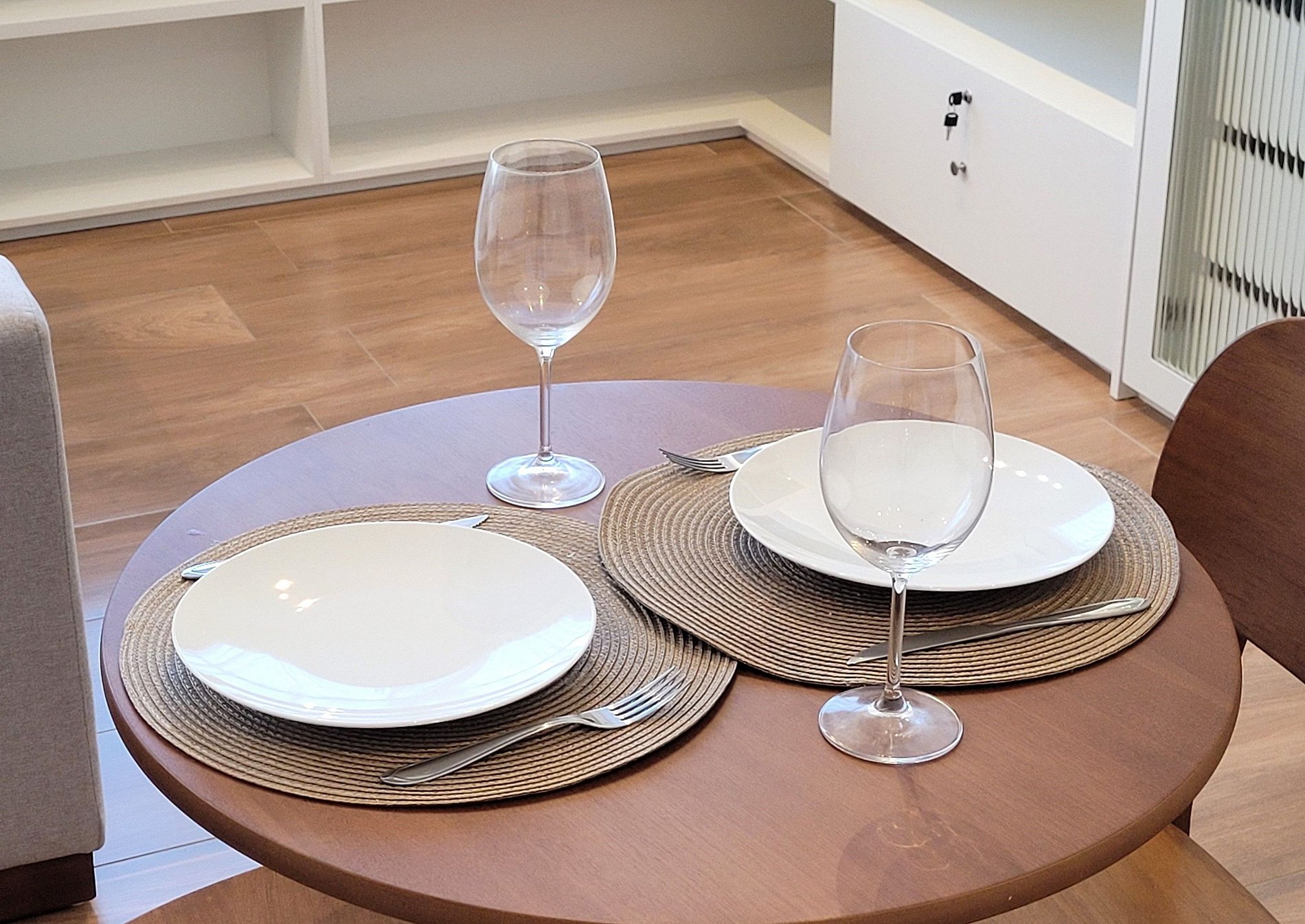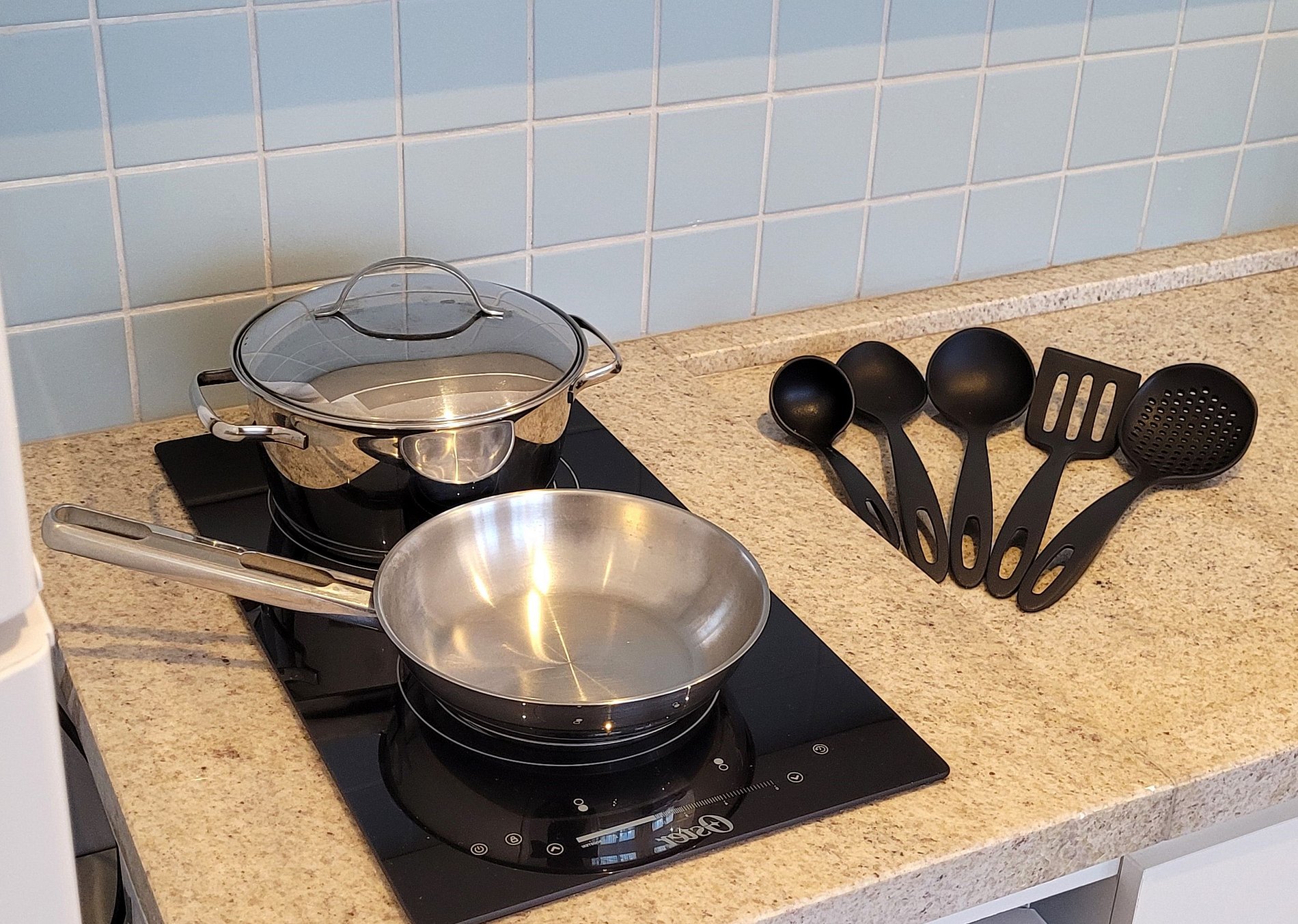 - Cozinha equipada com fogão de indução, micro-ondas, geladeira, pratos, talheres, copos
