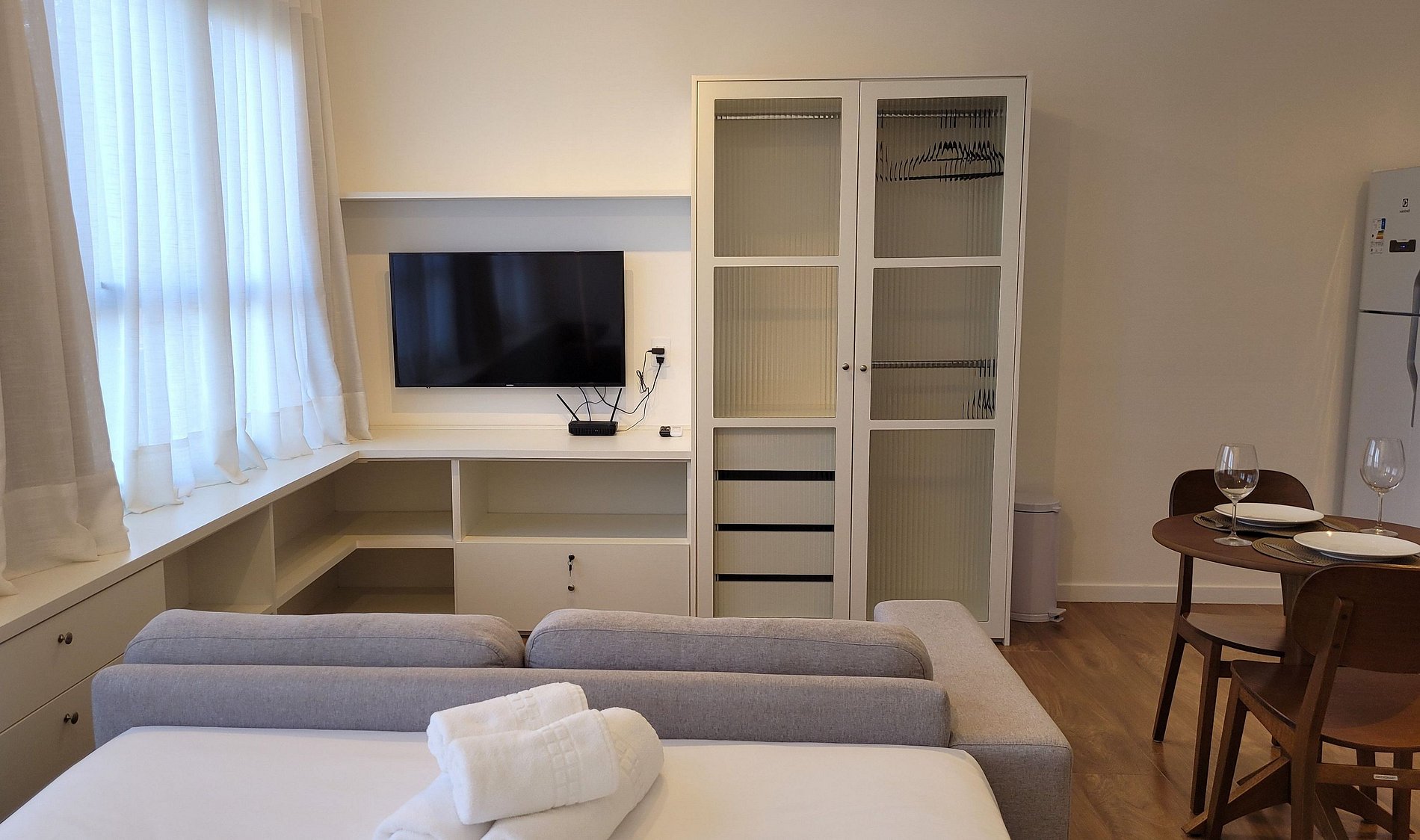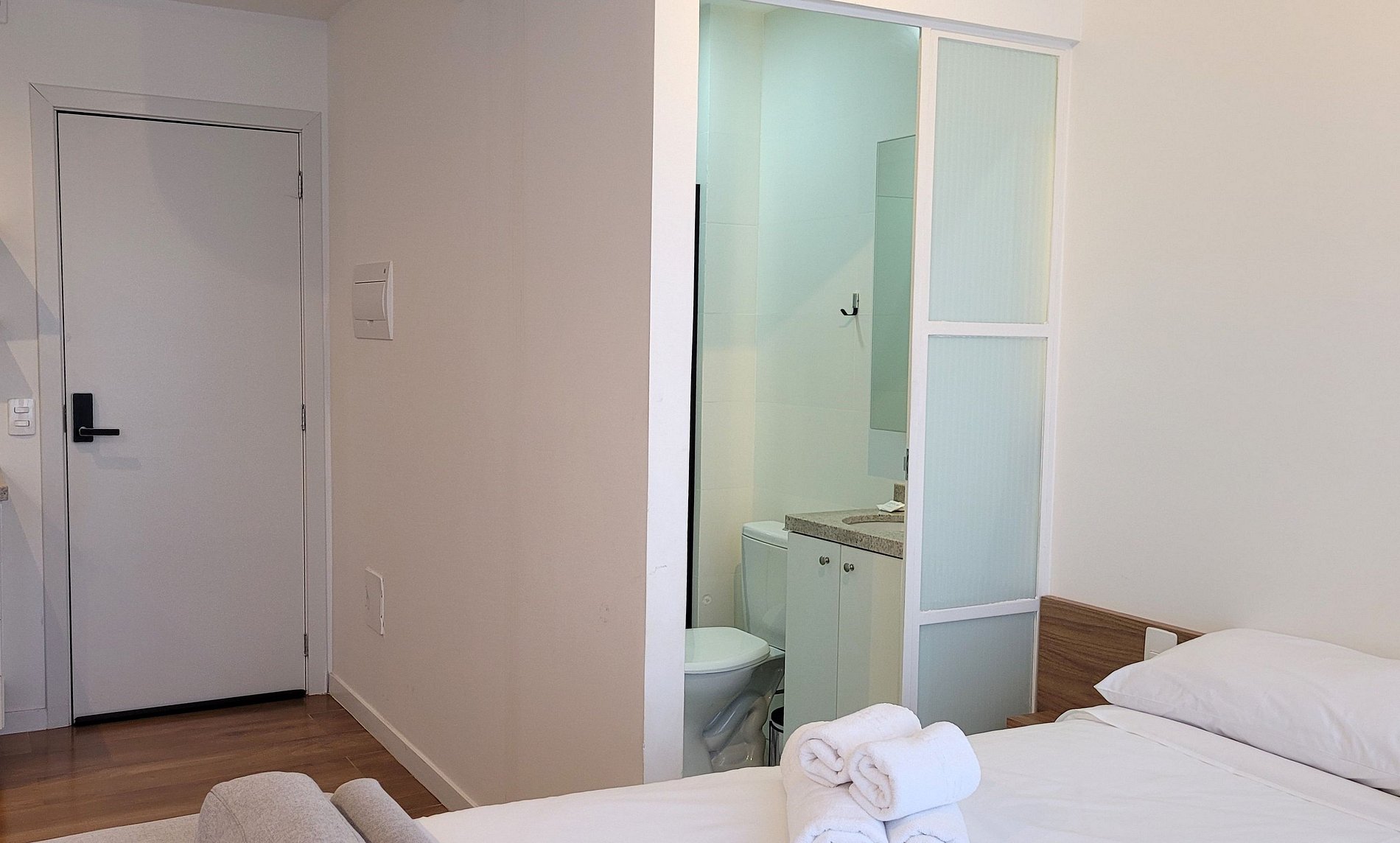 O check-in virtual precisa ser feito antecipadamente para acesso ao prédio e ao apartamento. ACESSO AO PRÉDIO: Reconhecimento Facial. ACESSO AO STUDIO: Senha