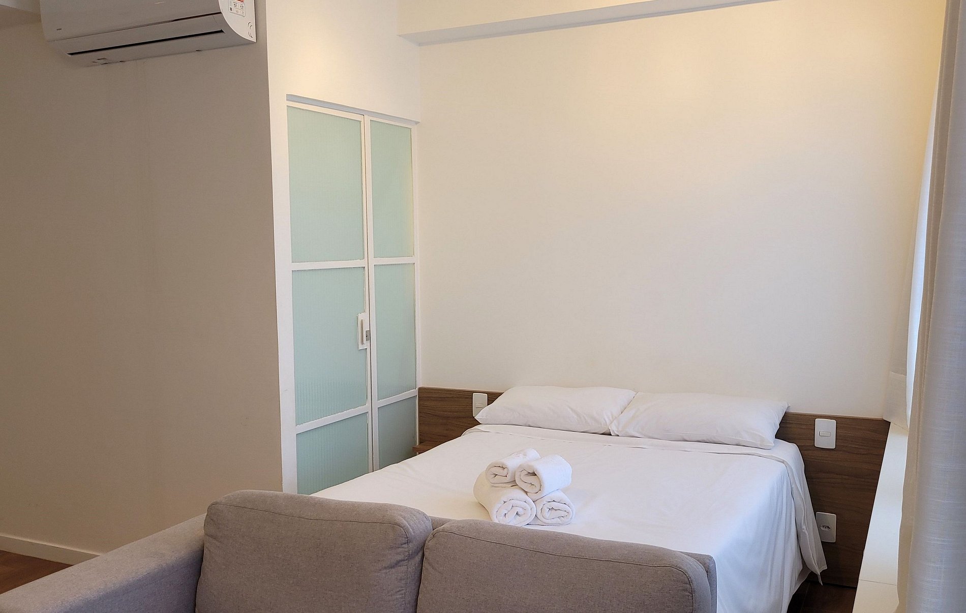 Flat aconchegante, com uma cama de casal, banheiro privativo, cozinha.