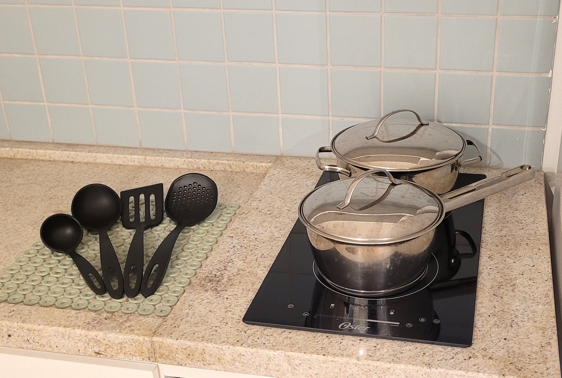 - Cozinha equipada com fogão de indução, micro-ondas, geladeira, pratos, talheres, copos