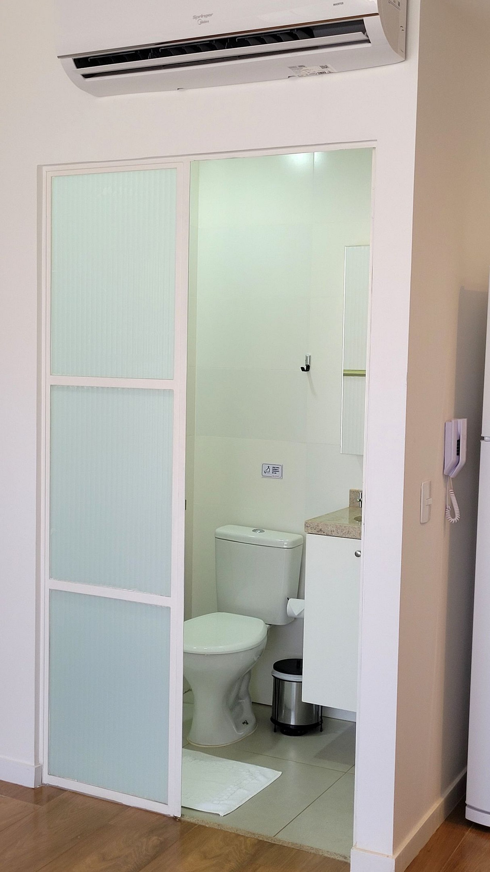 O check-in virtual precisa ser feito antecipadamente para acesso ao prédio e ao apartamento. ACESSO AO PRÉDIO: Reconhecimento Facial. ACESSO AO STUDIO: Senha