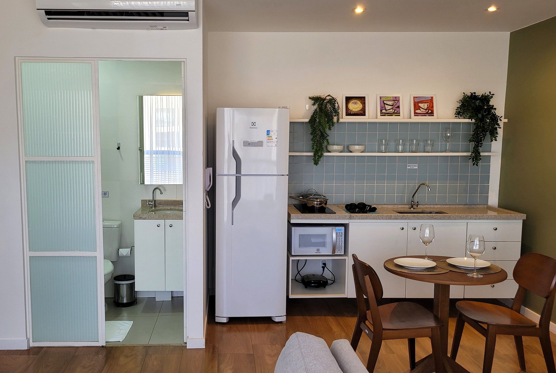 - Cozinha equipada com fogão de indução, micro-ondas, geladeira, pratos, talheres, copos