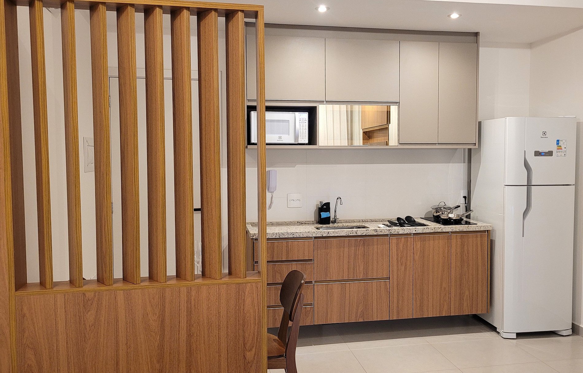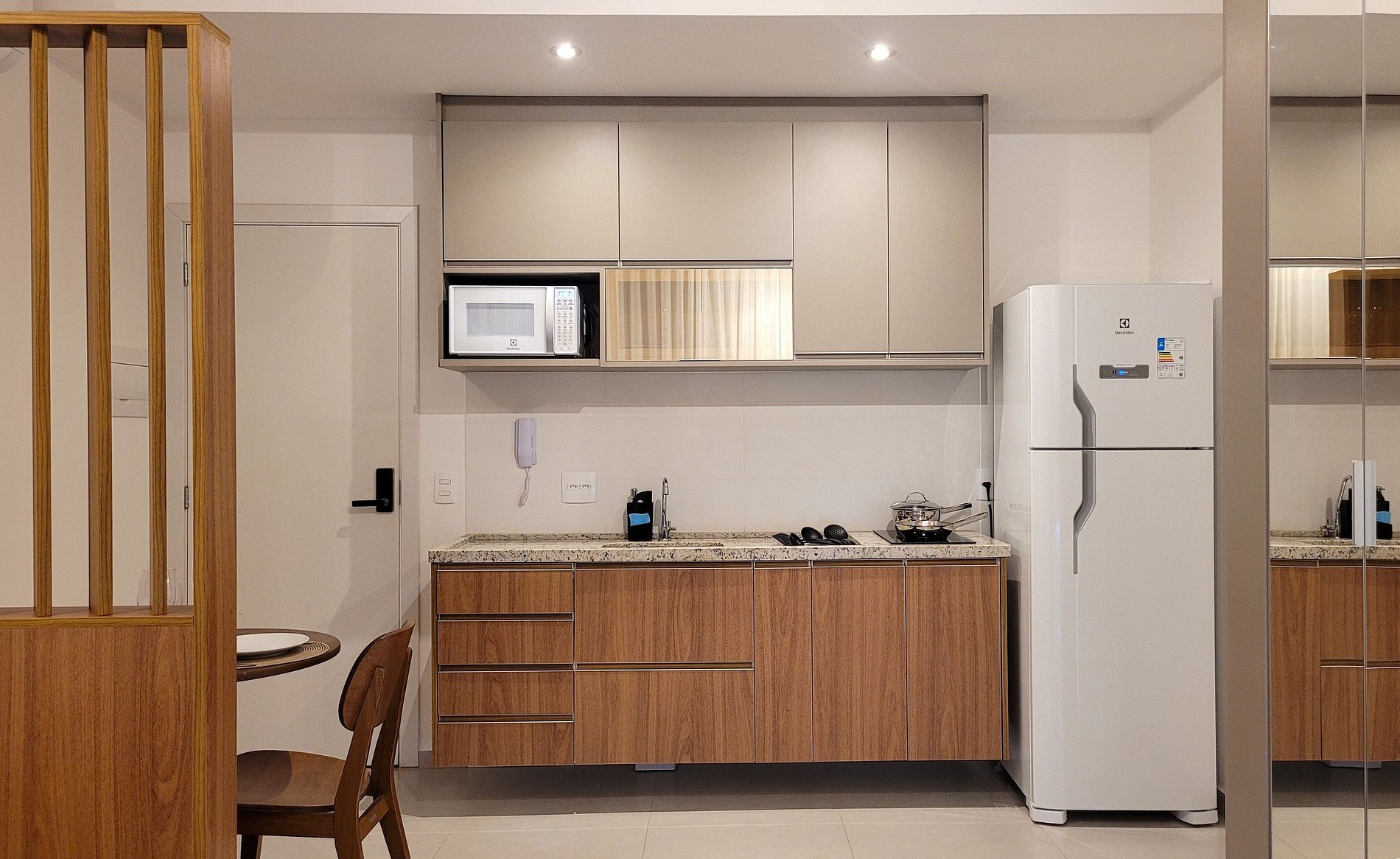 - Cozinha equipada com fogão de indução, micro-ondas, geladeira, pratos, talheres, copos