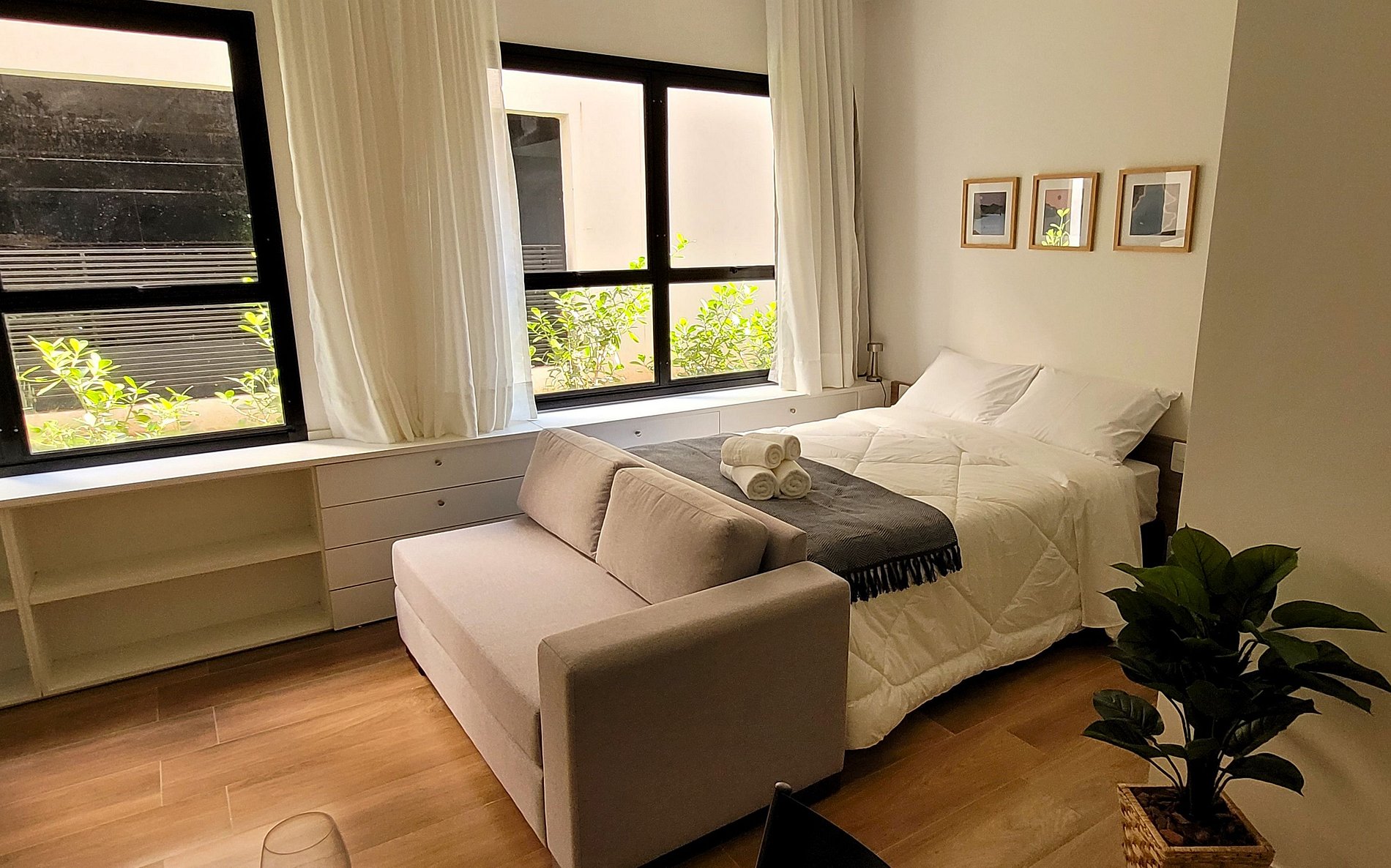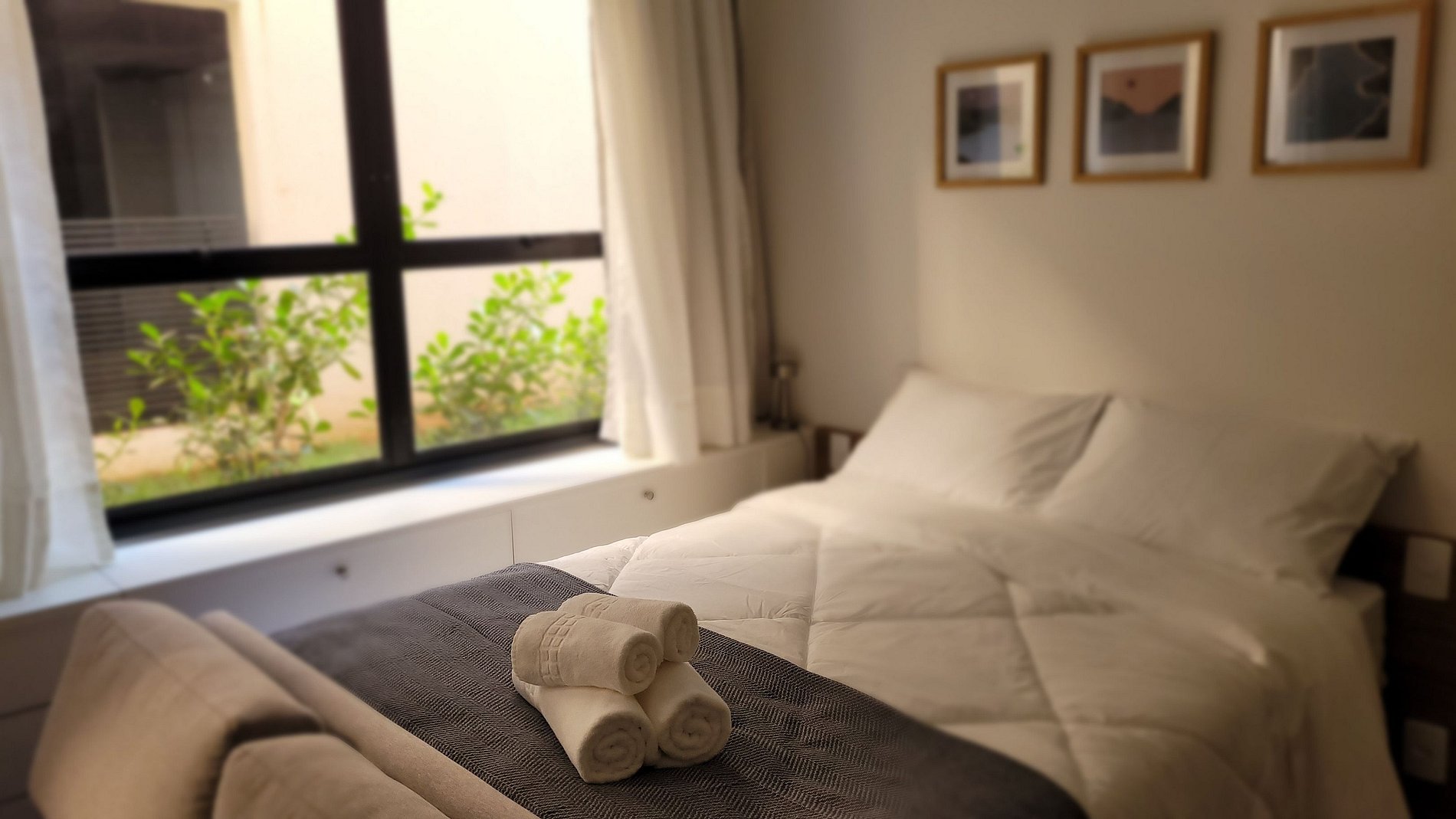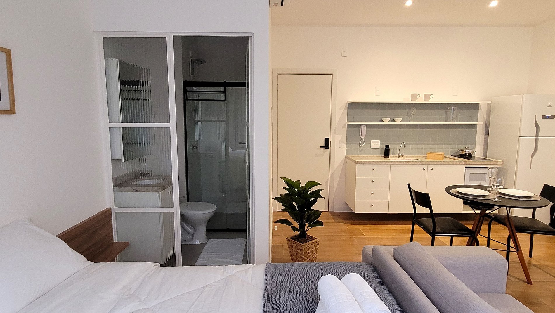 O check-in virtual precisa ser feito antecipadamente para acesso ao prédio e ao apartamento. ACESSO AO PRÉDIO: Reconhecimento Facial. ACESSO AO STUDIO: Senha
