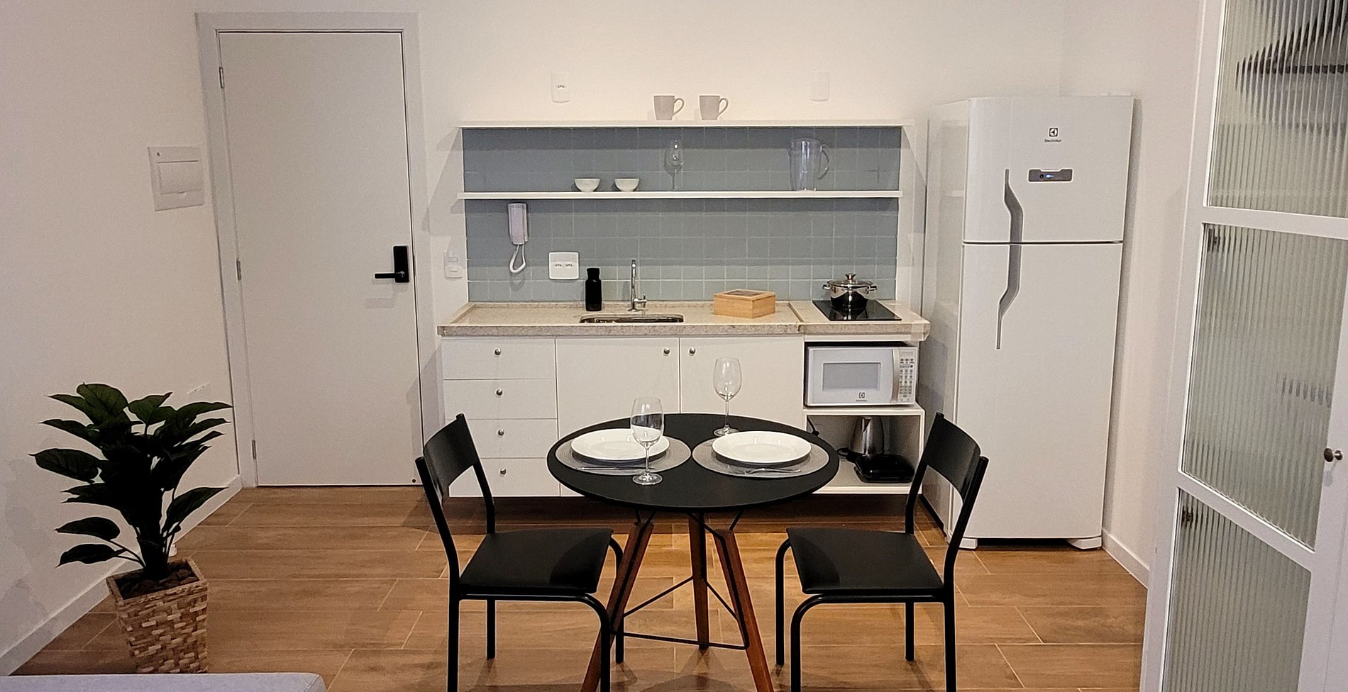 - Cozinha equipada com fogão de indução, micro-ondas, geladeira, pratos, talheres, copos