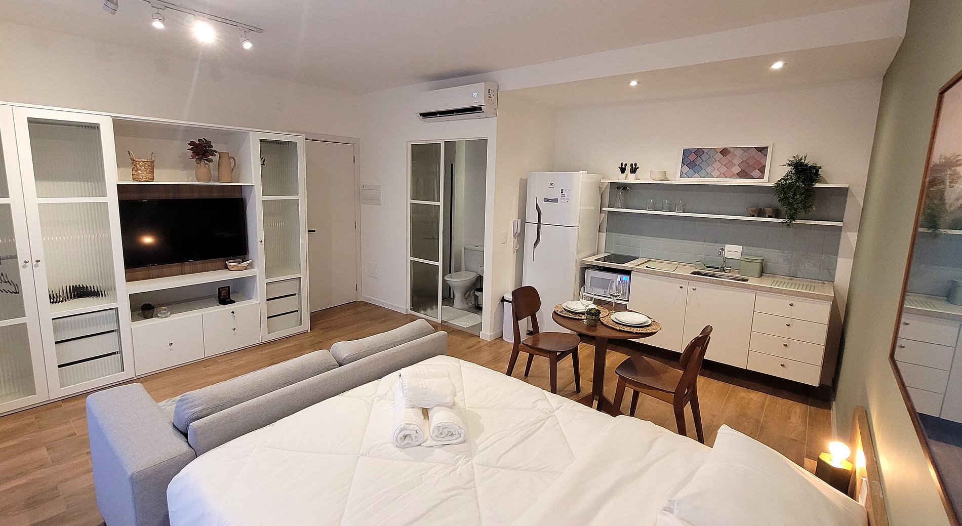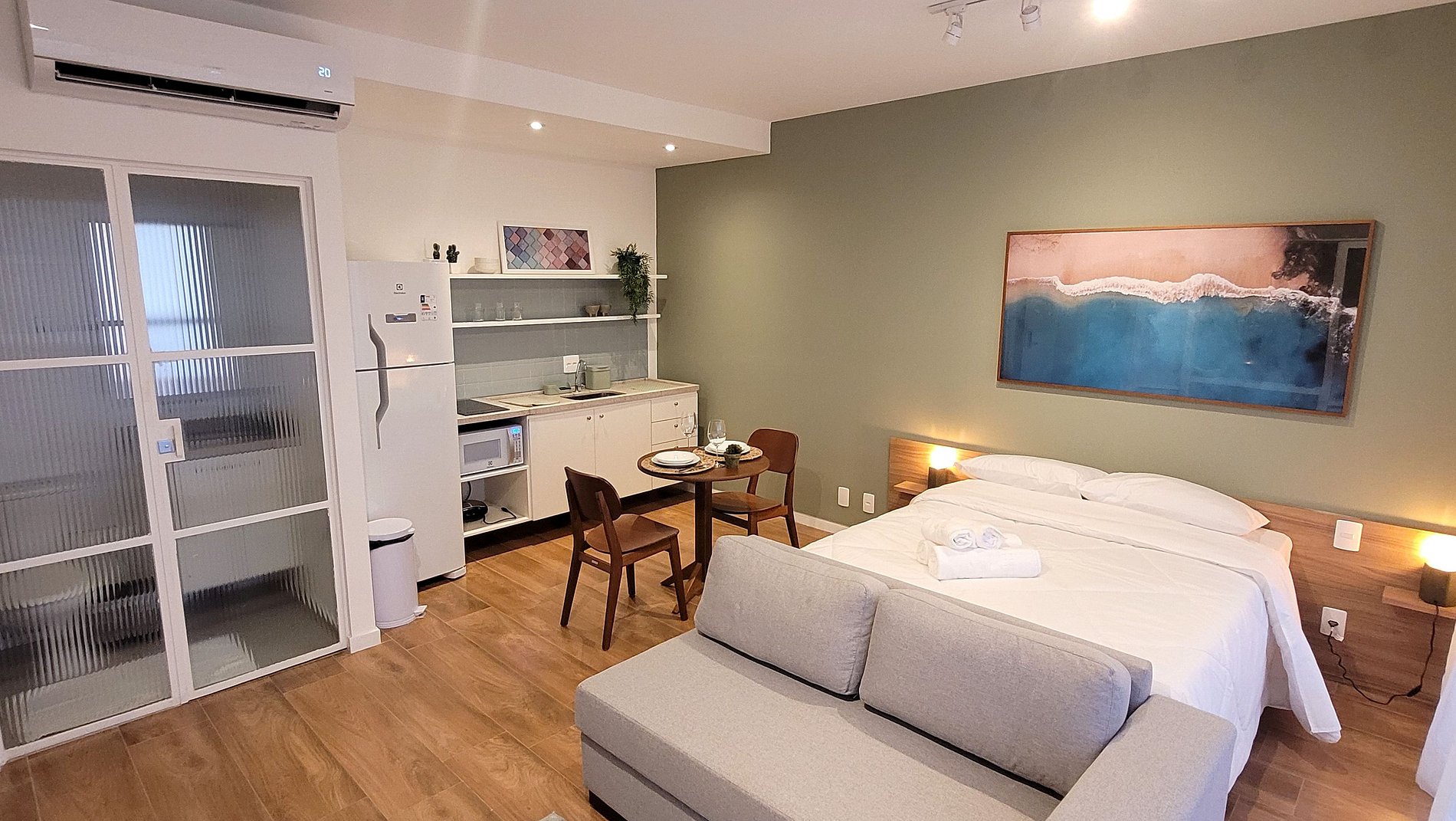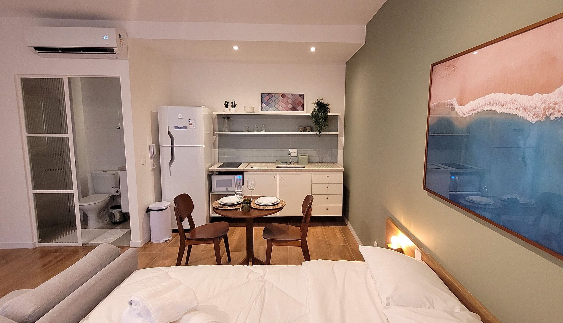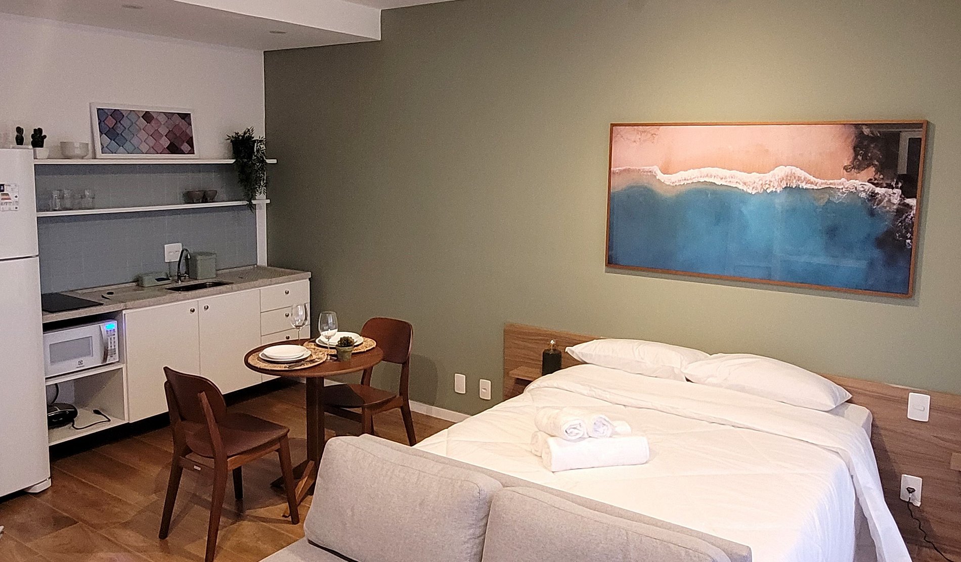 Flat aconchegante e decorado, com sacada e vista. Uma cama casal, banheiro privativo, cozinha.