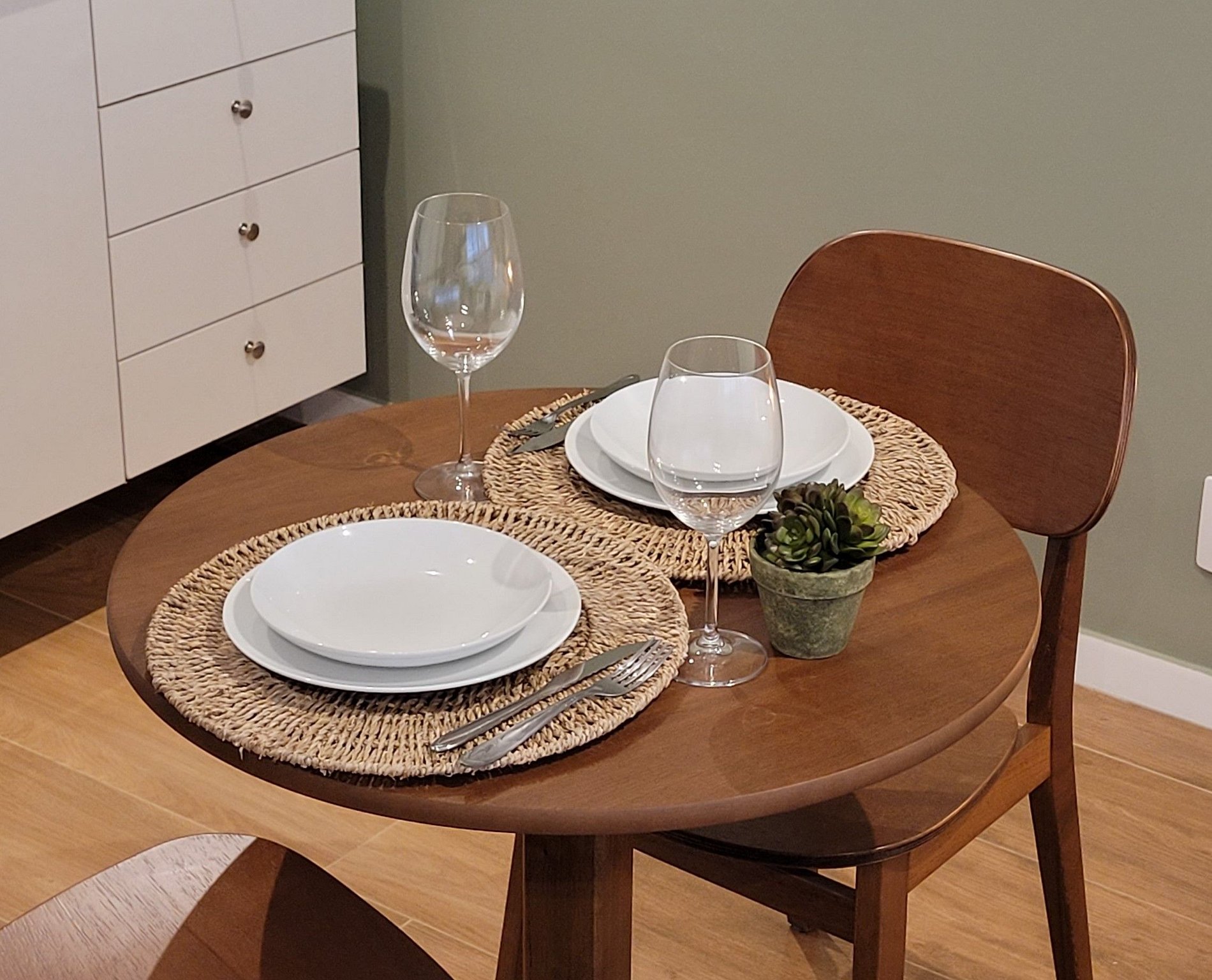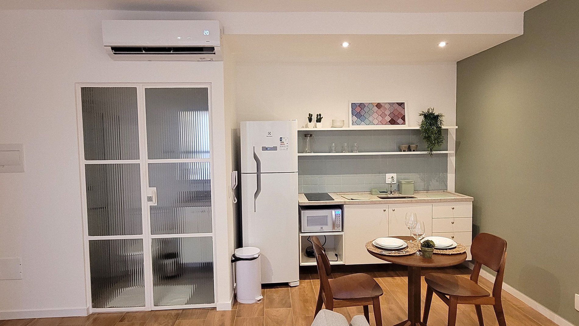 - Cozinha equipada com fogão de indução, micro-ondas, geladeira, pratos, talheres, copos