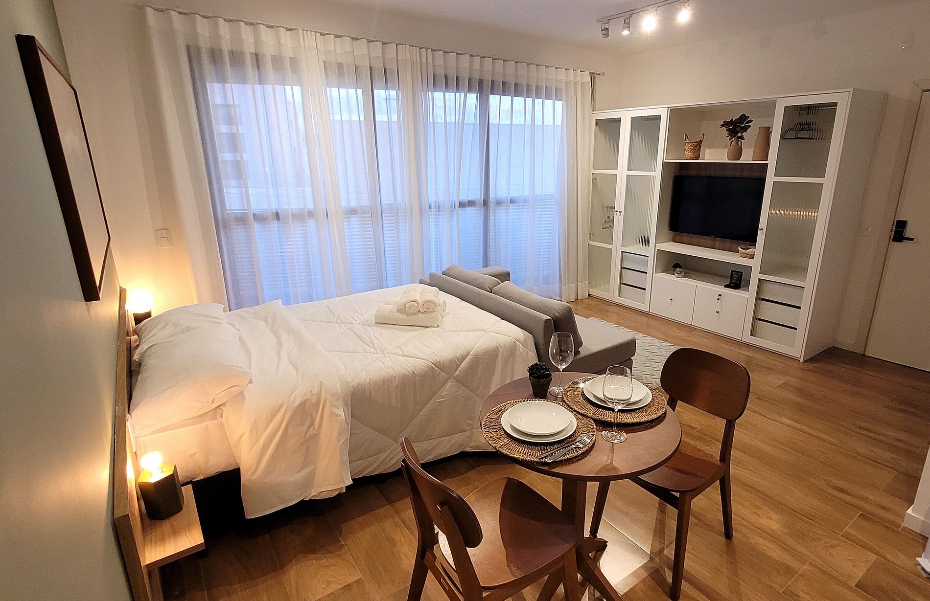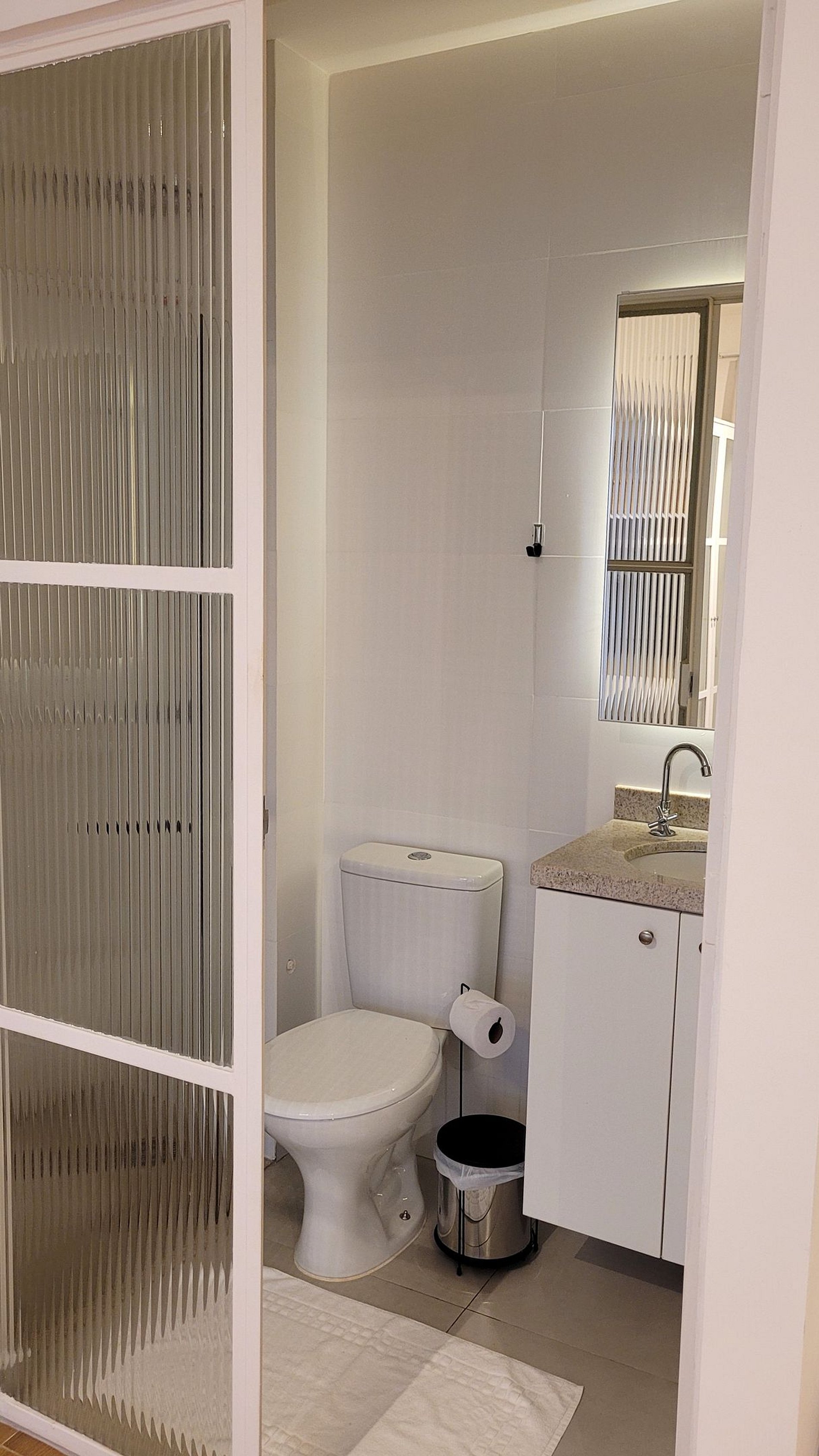 O check-in virtual precisa ser feito antecipadamente para acesso ao prédio e ao apartamento. ACESSO AO PRÉDIO: Reconhecimento Facial. ACESSO AO STUDIO: Senha