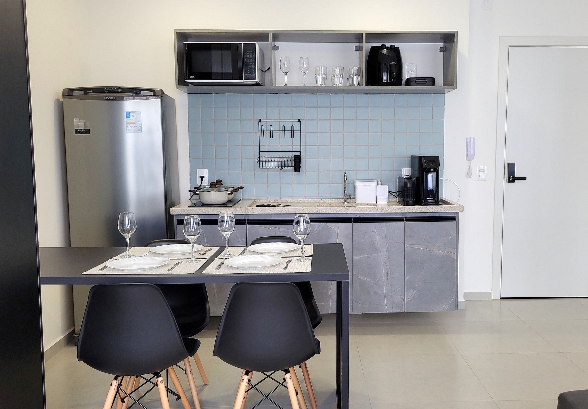 - Cozinha equipada com fogão de indução, micro-ondas, geladeira, pratos, talheres, copos