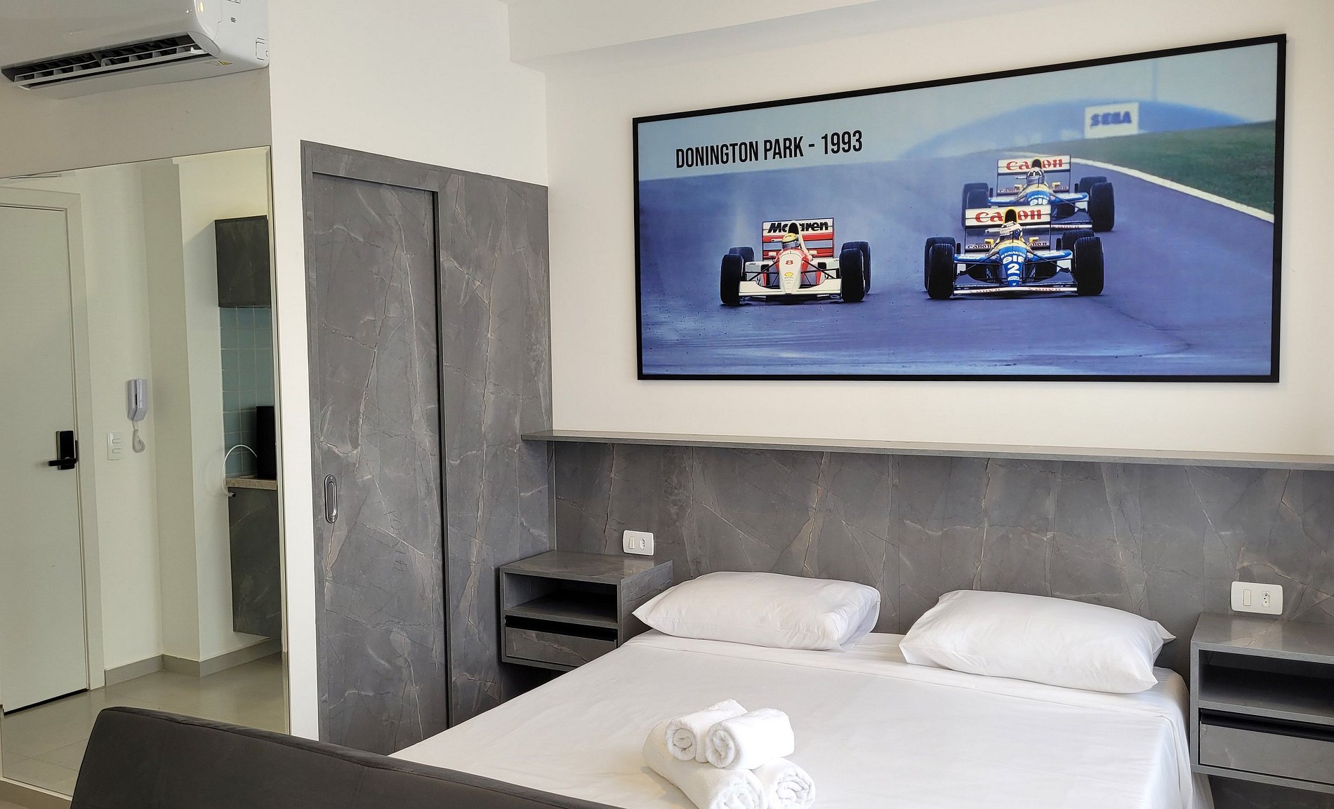 Flat aconchegante, com uma cama de casal, banheiro privativo, cozinha.