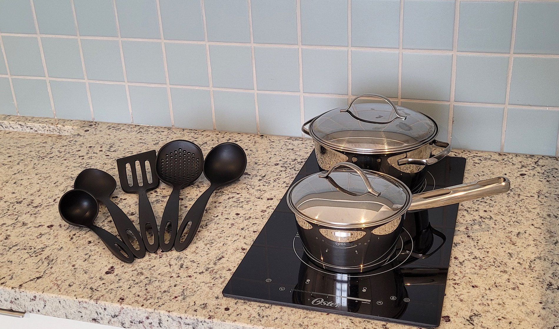 - Cozinha equipada com fogão de indução, micro-ondas, geladeira, pratos, talheres, copos