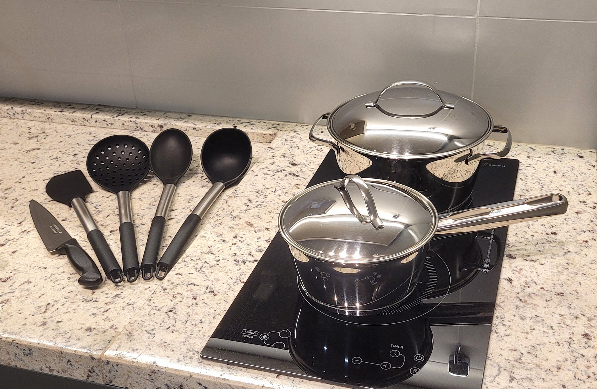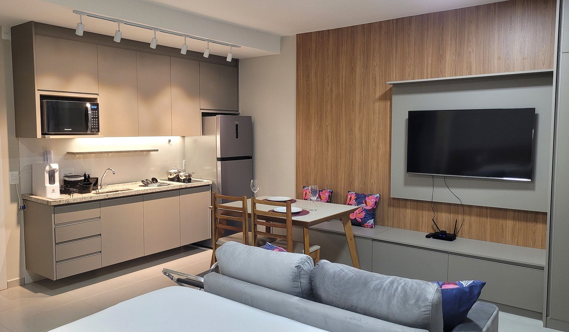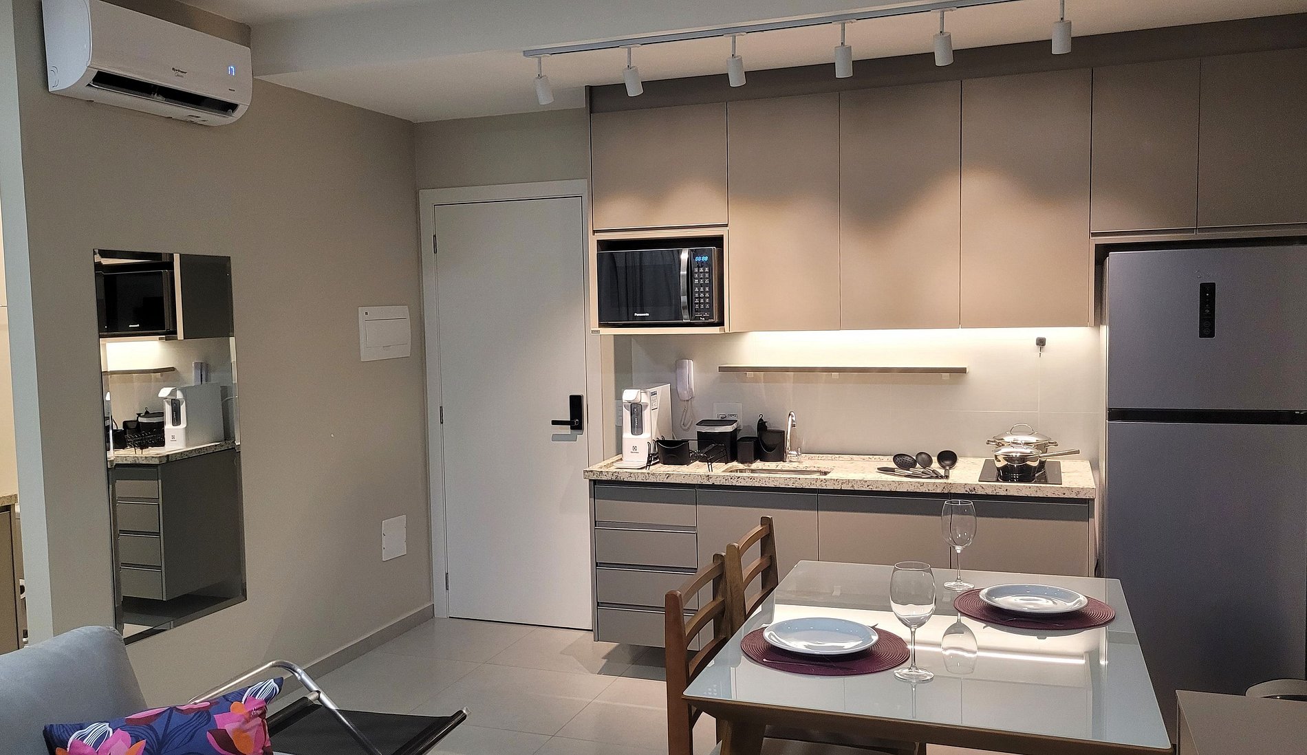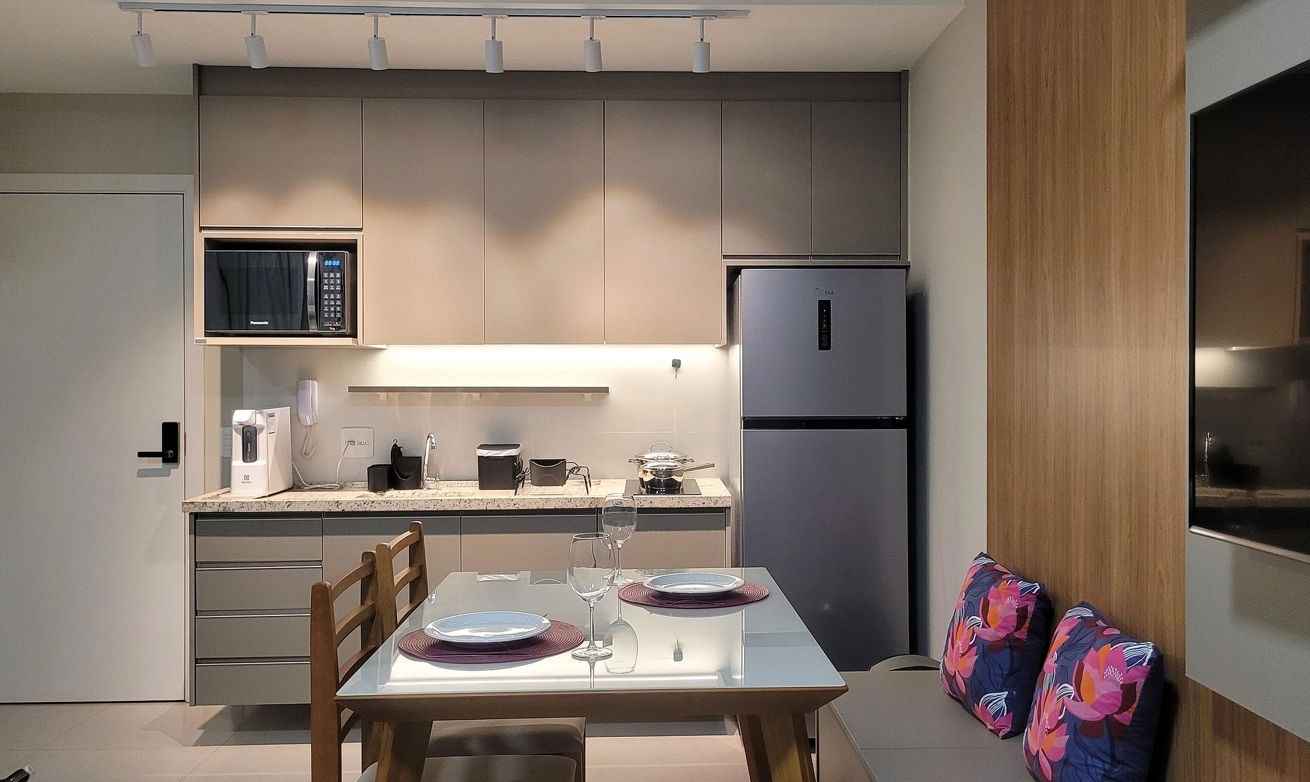 - Cozinha equipada com fogão de indução, micro-ondas, geladeira, pratos, talheres, copos