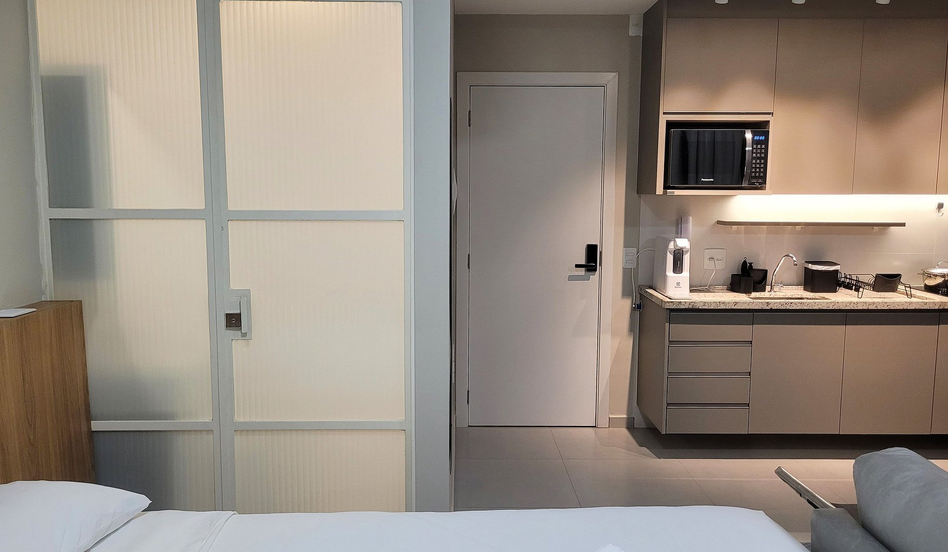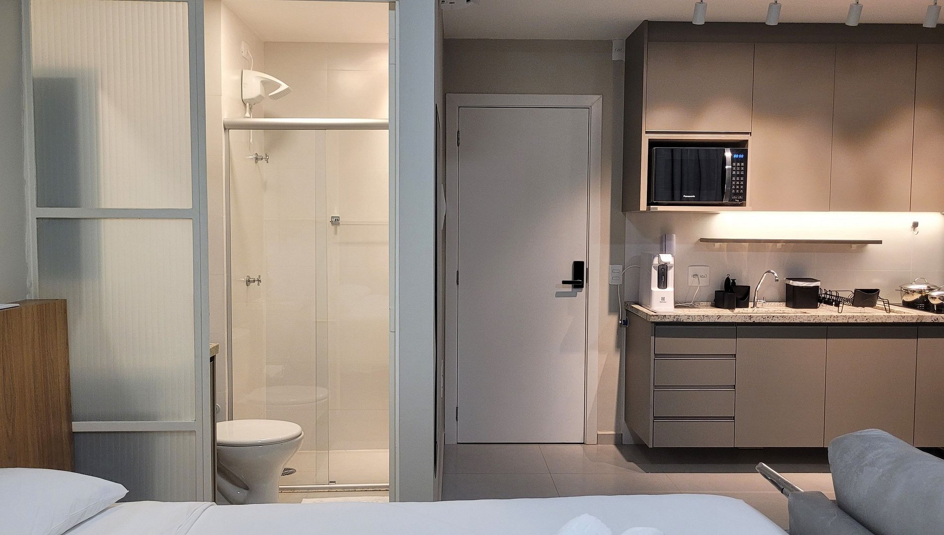 O check-in virtual precisa ser feito antecipadamente para acesso ao prédio e ao apartamento. ACESSO AO PRÉDIO: Reconhecimento Facial. ACESSO AO STUDIO: Senha