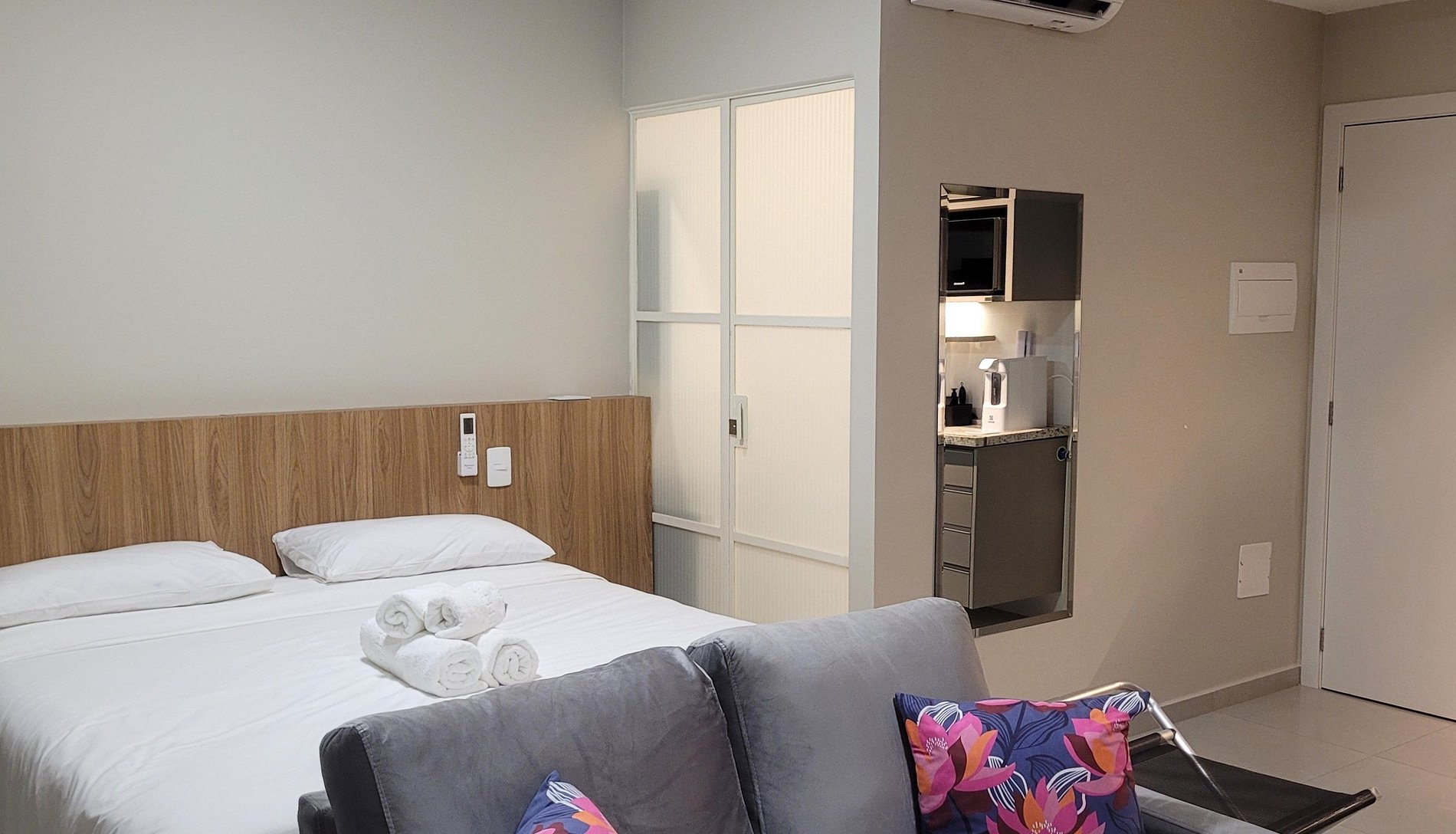 Flat aconchegante, com uma cama de casal, banheiro privativo, cozinha.