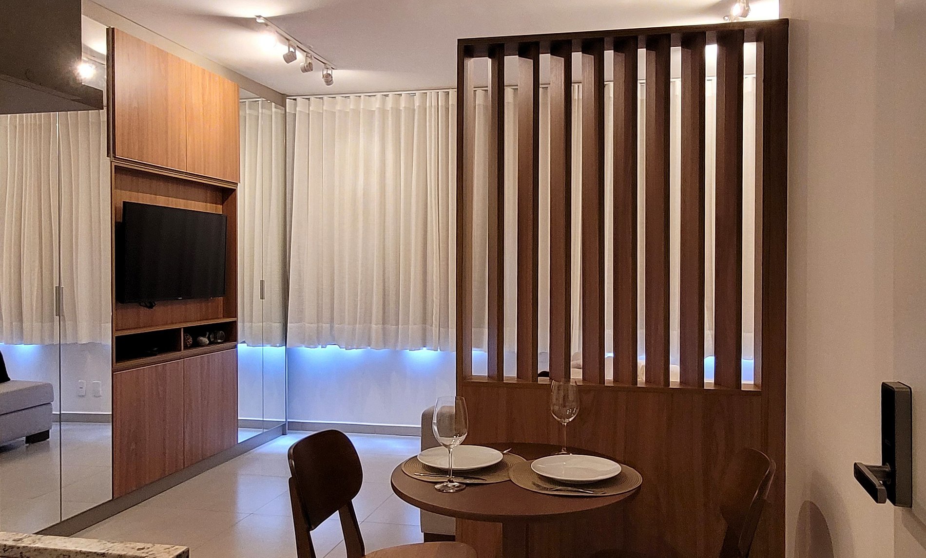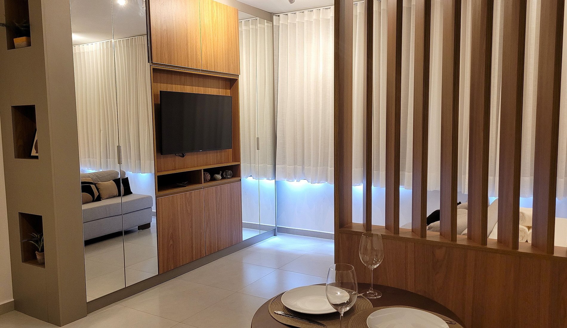 O check-in virtual precisa ser feito antecipadamente para acesso ao prédio e ao apartamento. ACESSO AO PRÉDIO: Reconhecimento Facial. ACESSO AO STUDIO: Senha