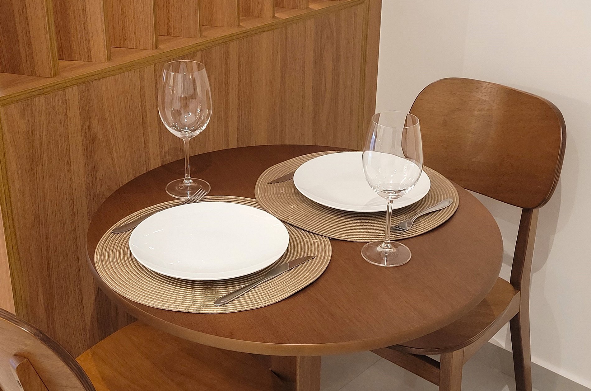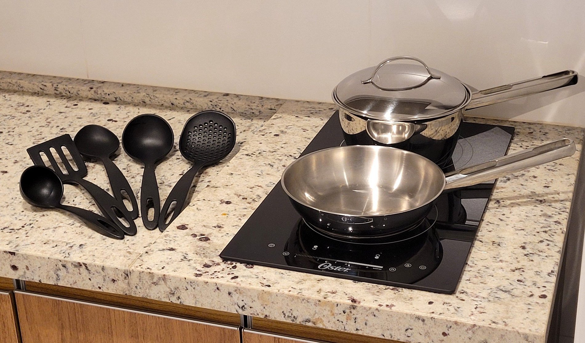 - Cozinha equipada com fogão de indução, micro-ondas, geladeira, pratos, talheres, copos