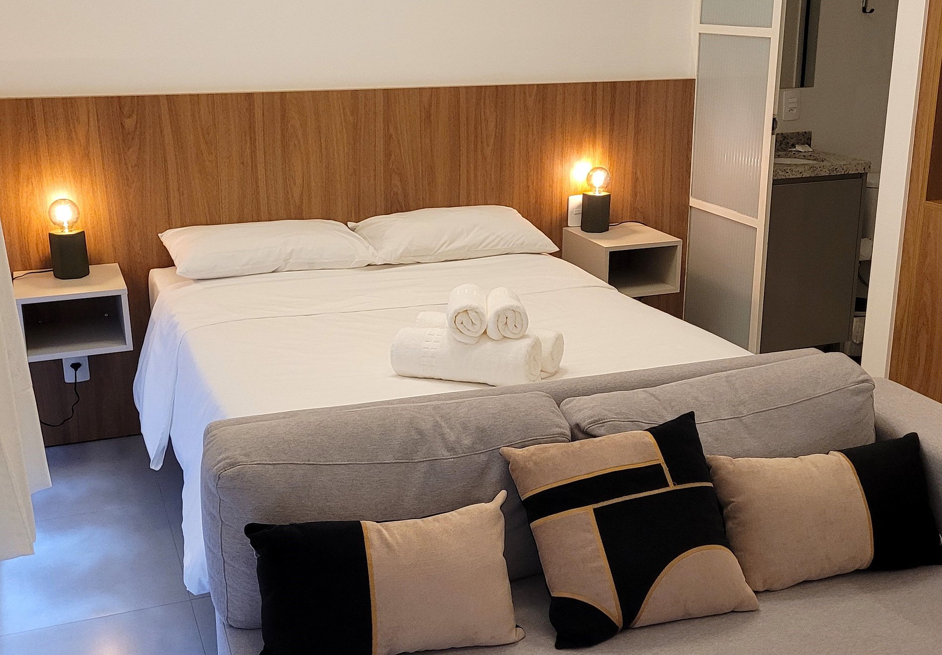 Flat aconchegante, com uma cama de casal, banheiro privativo, cozinha.