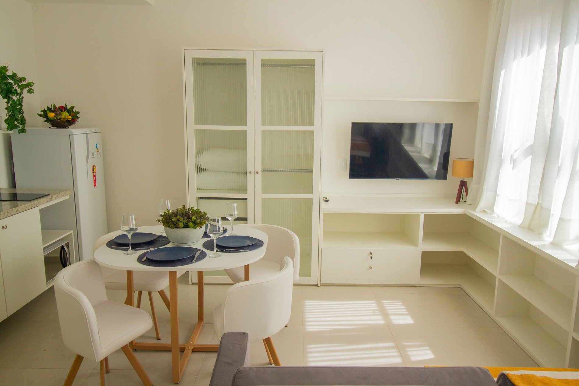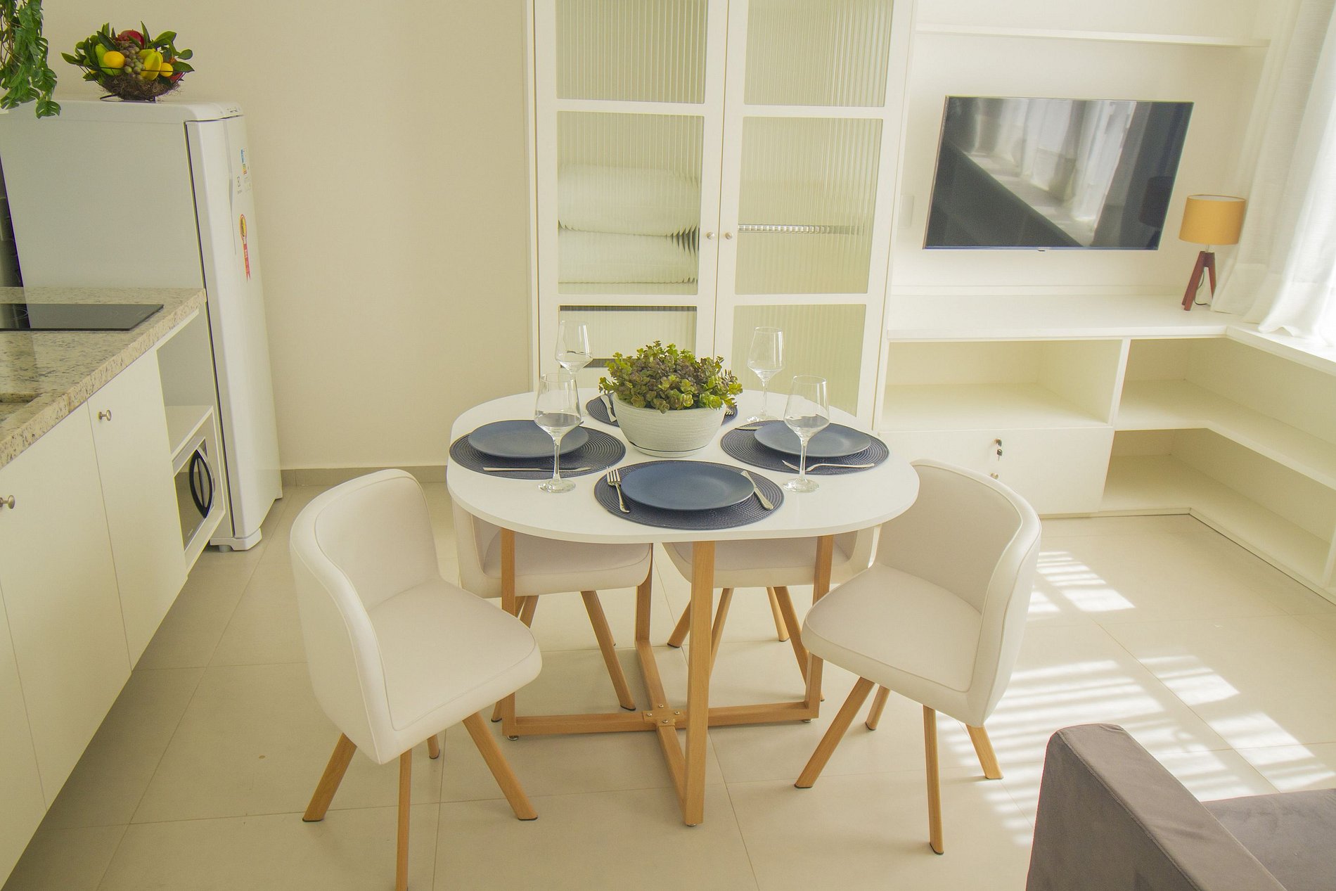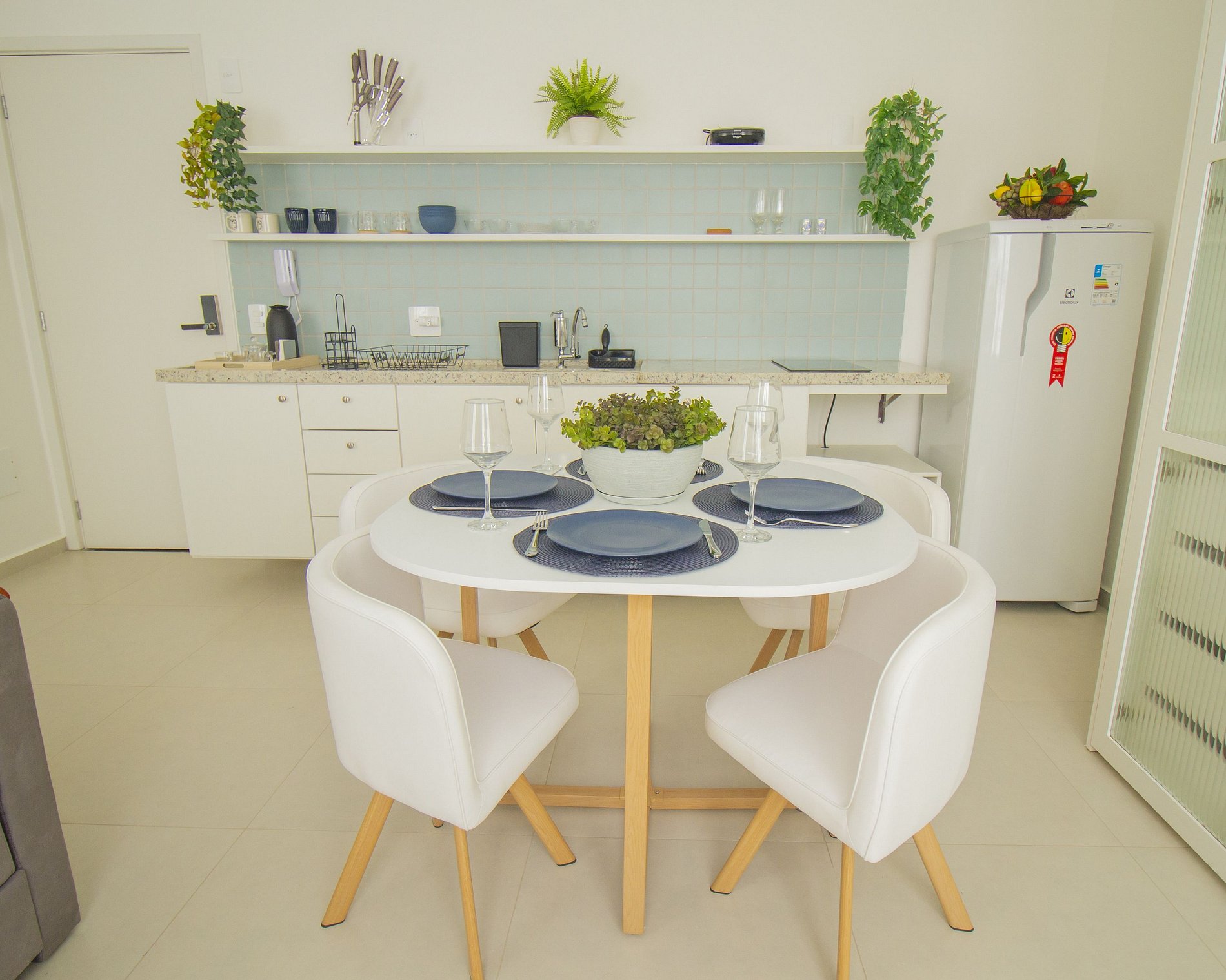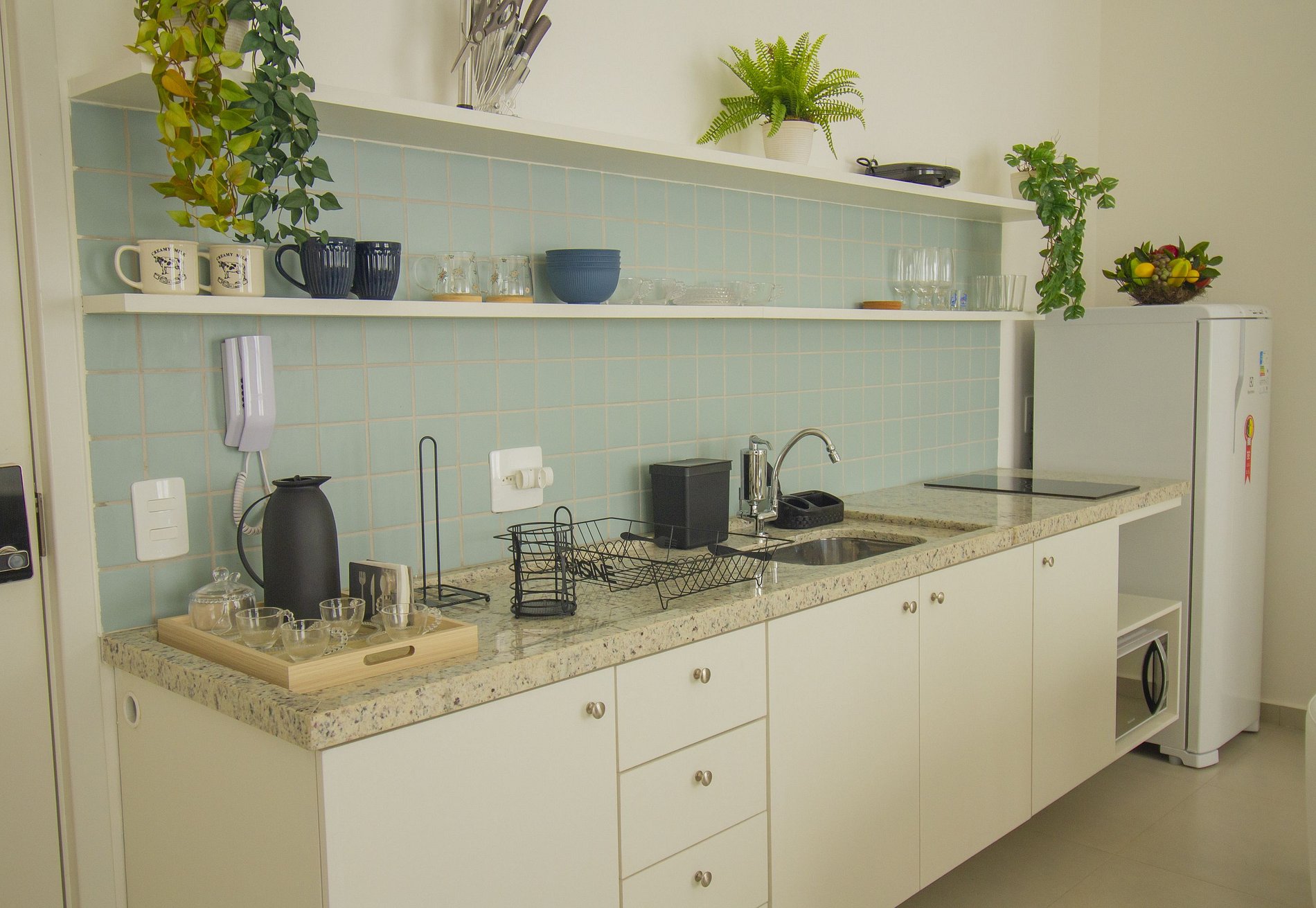 - Cozinha equipada com fogão de indução, micro-ondas, geladeira, pratos, talheres, copos