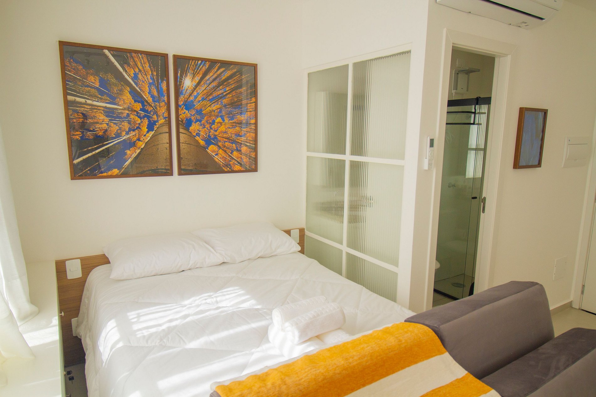 Flat aconchegante, com uma cama de casal e um sofá-cama (comporta até 4 pessoas), banheiro privativo, cozinha.