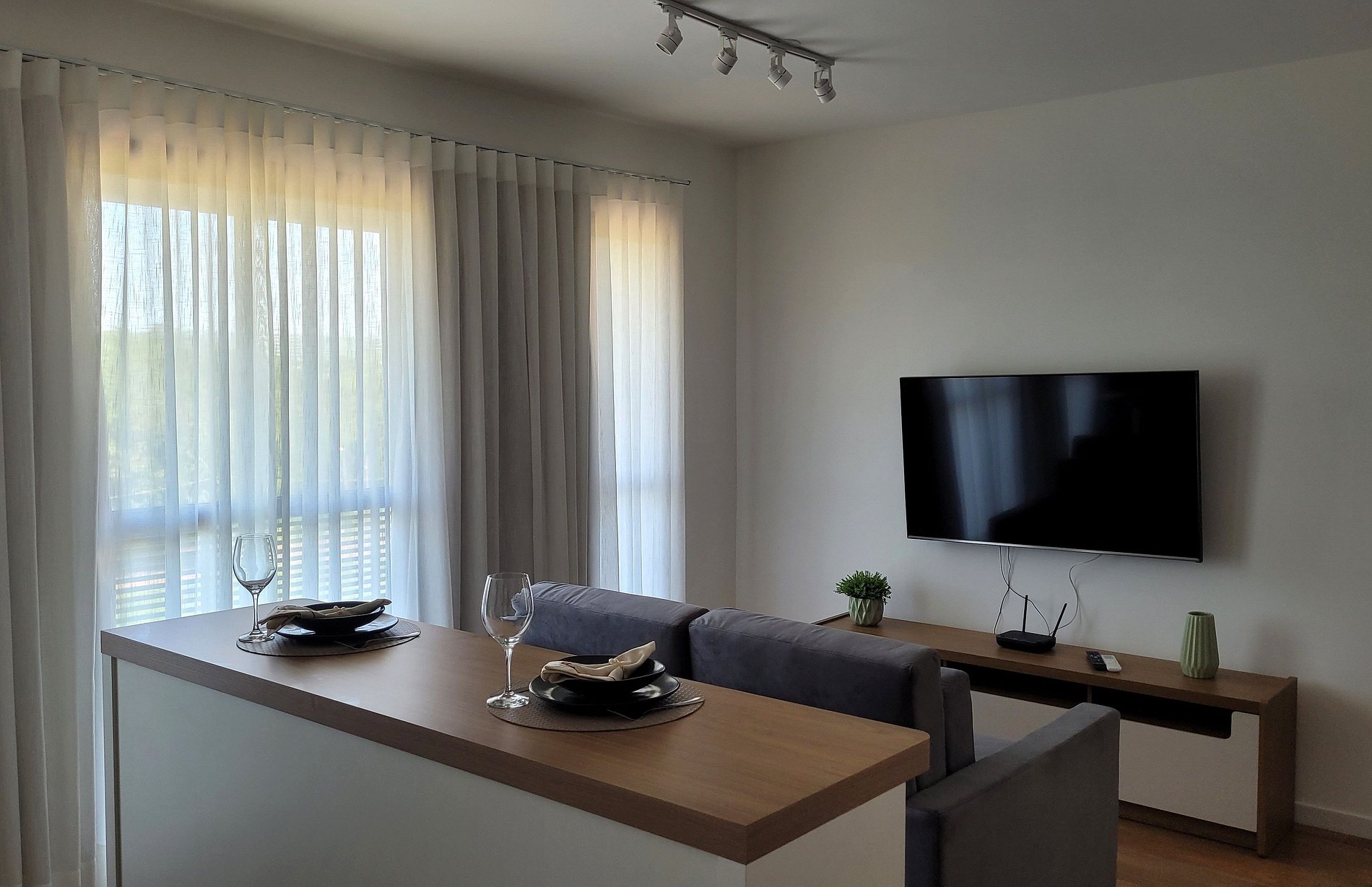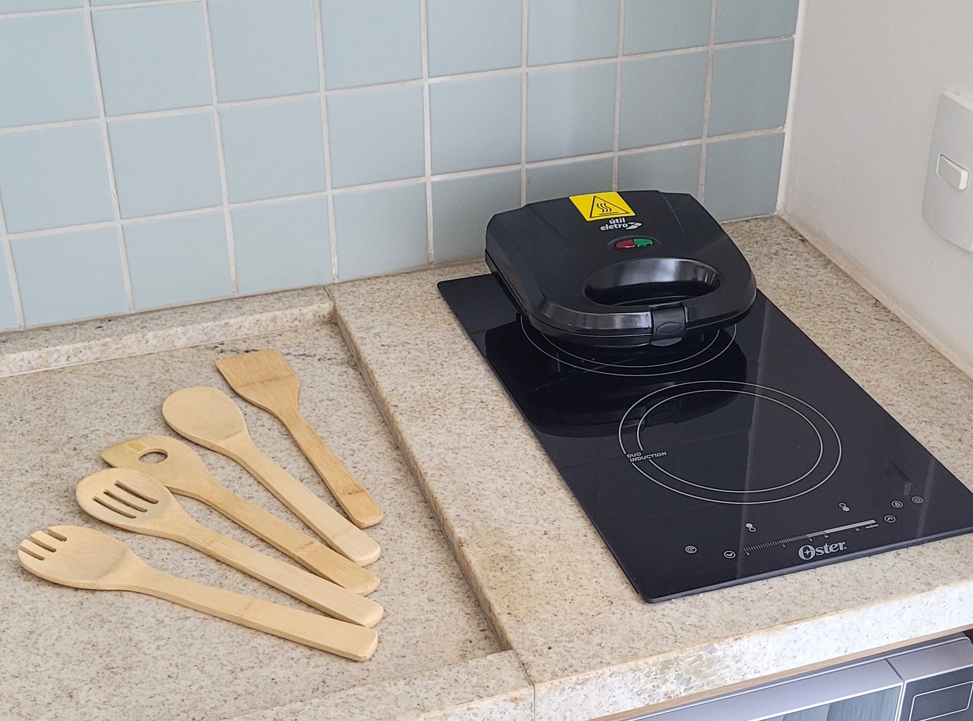 - Cozinha equipada com fogão de indução, micro-ondas, geladeira, pratos, talheres, copos