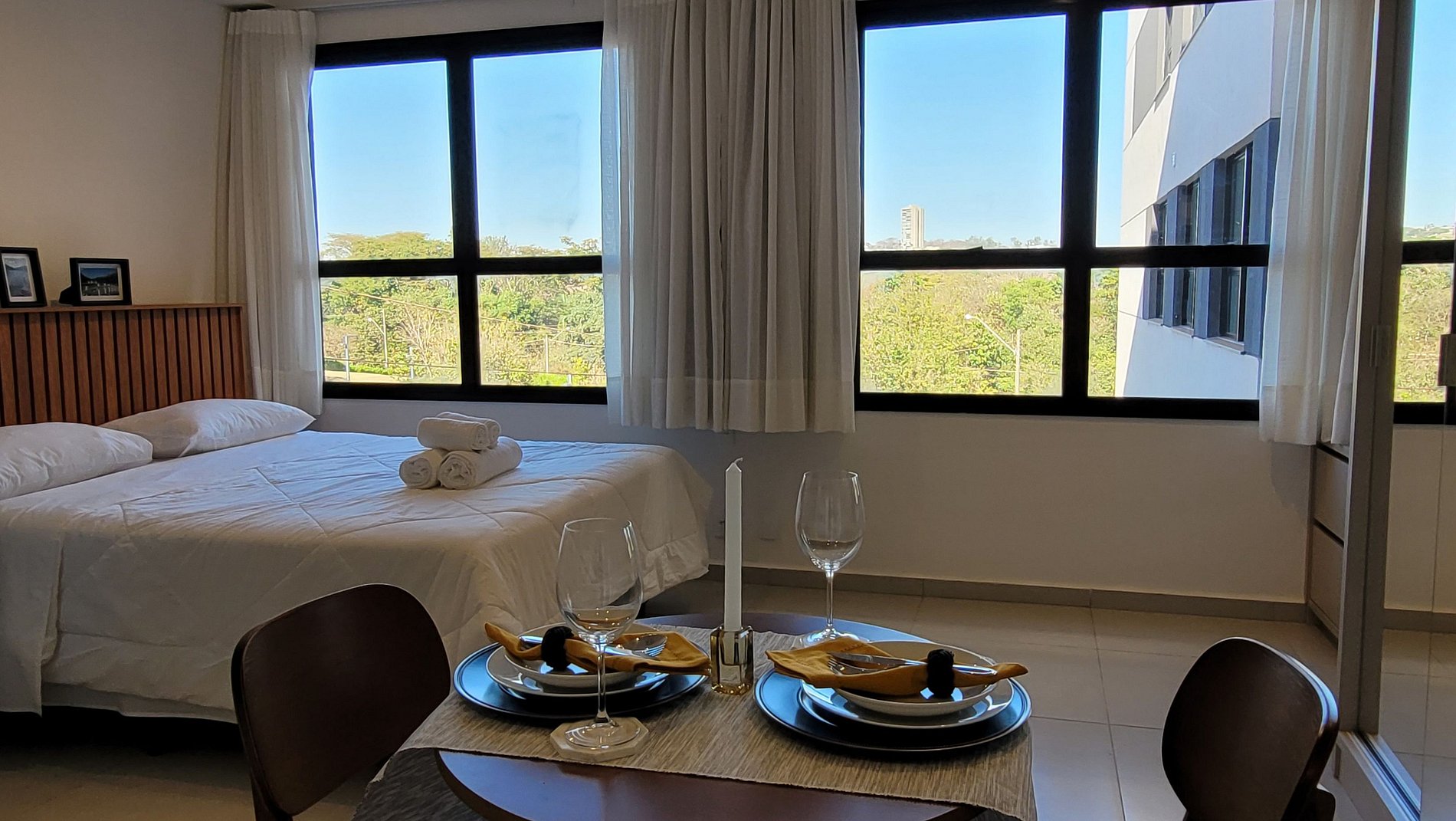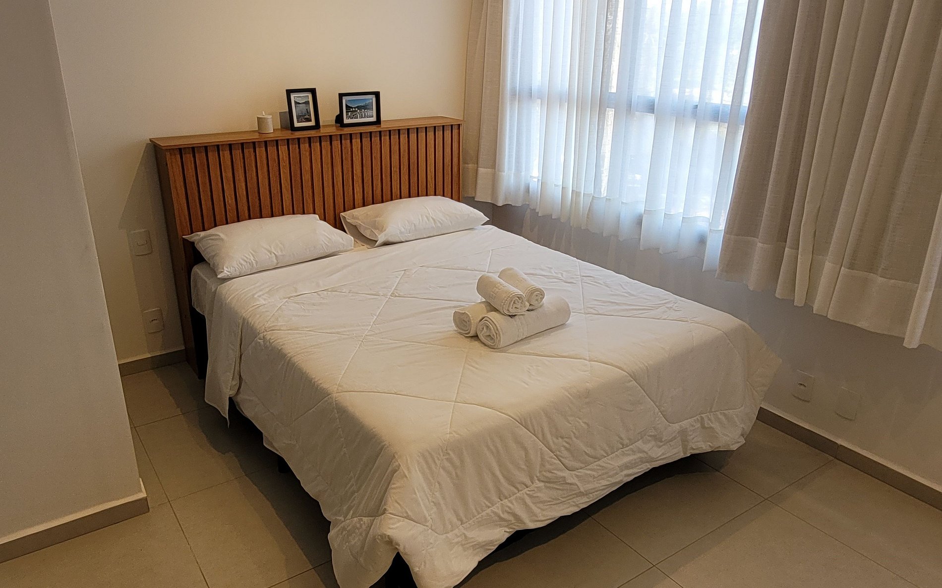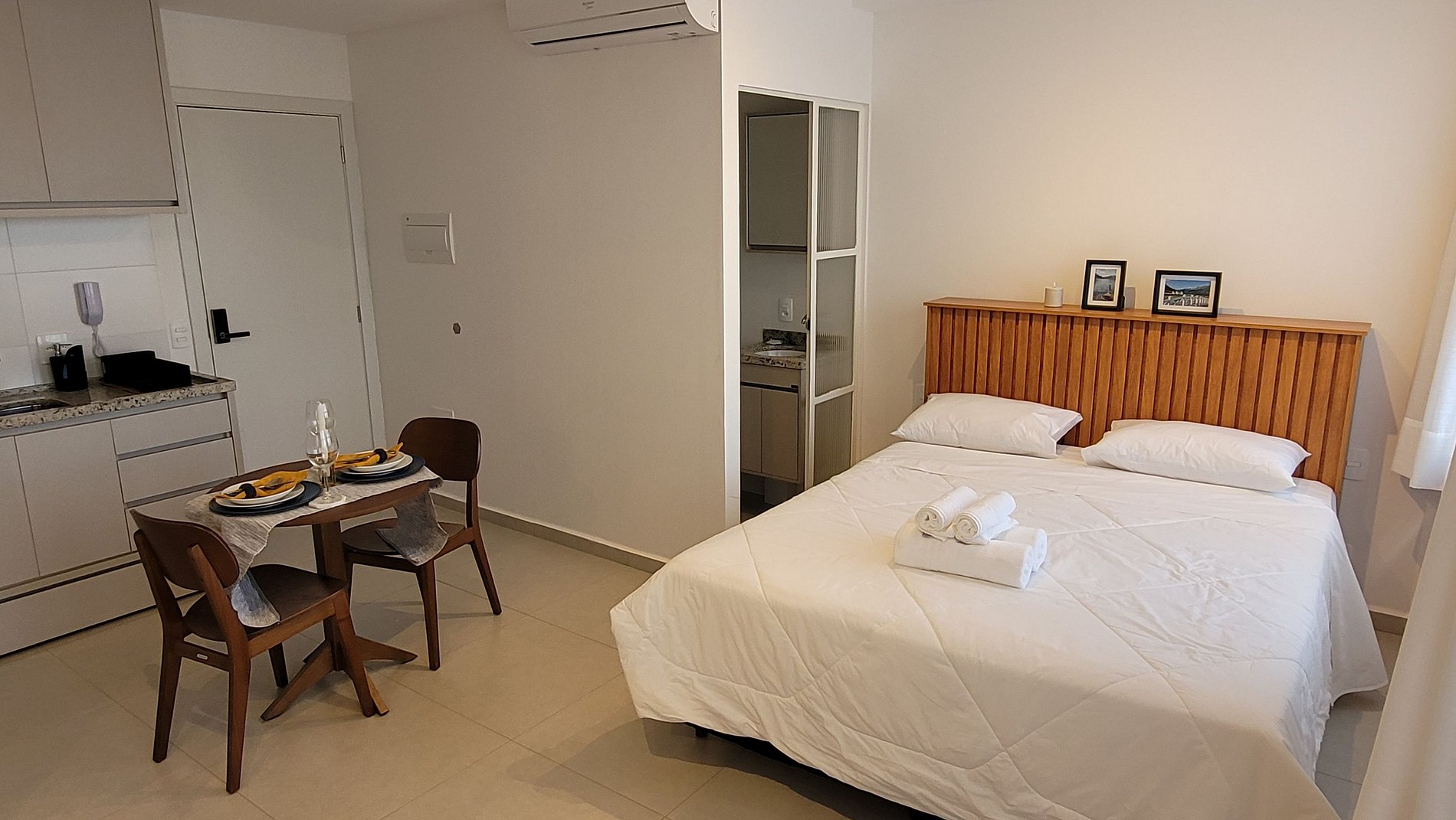 Flat aconchegante, com uma cama Queen, banheiro privativo, cozinha.
