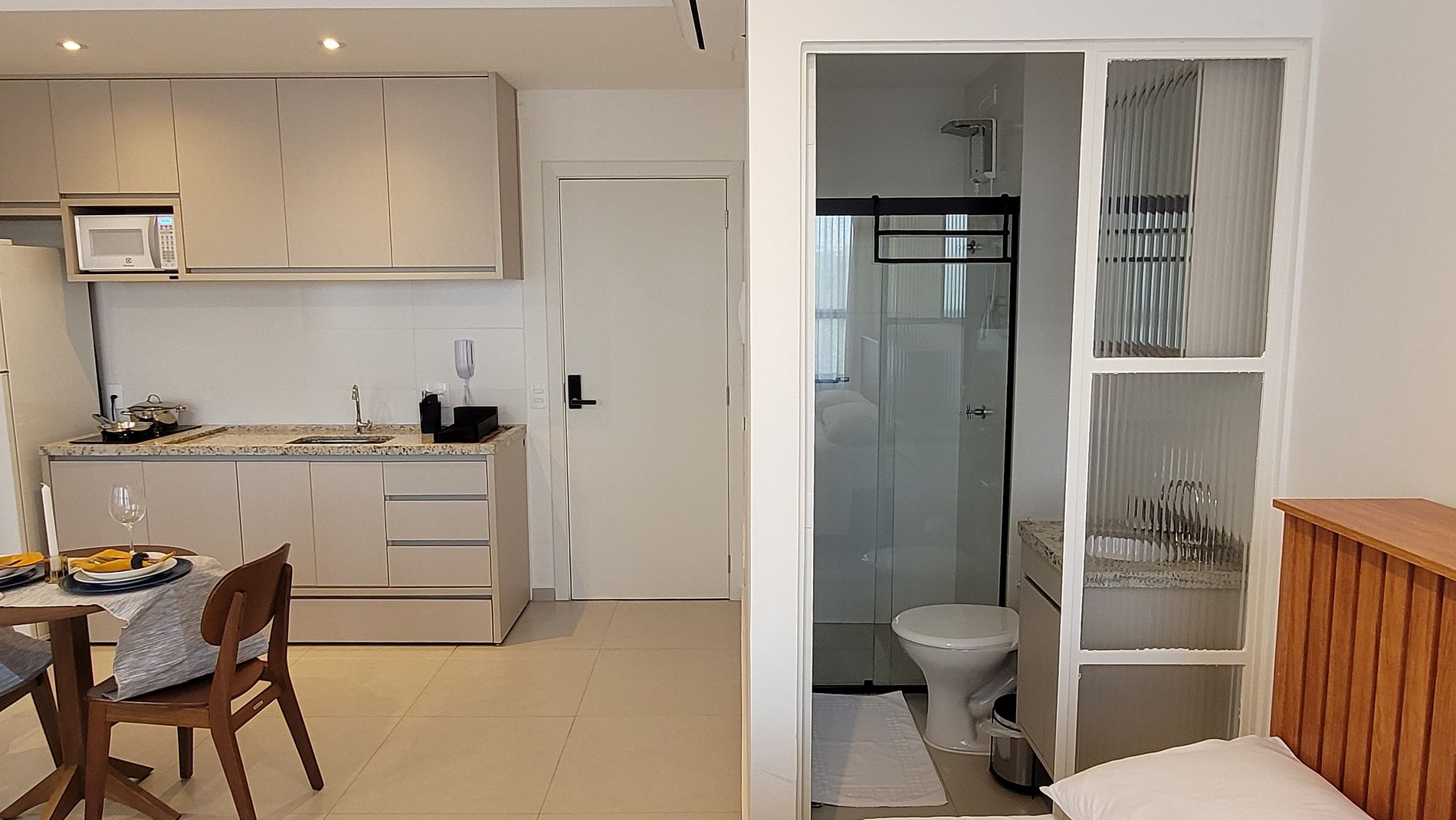 - Cozinha equipada com fogão de indução, micro-ondas, geladeira, pratos, talheres, copos