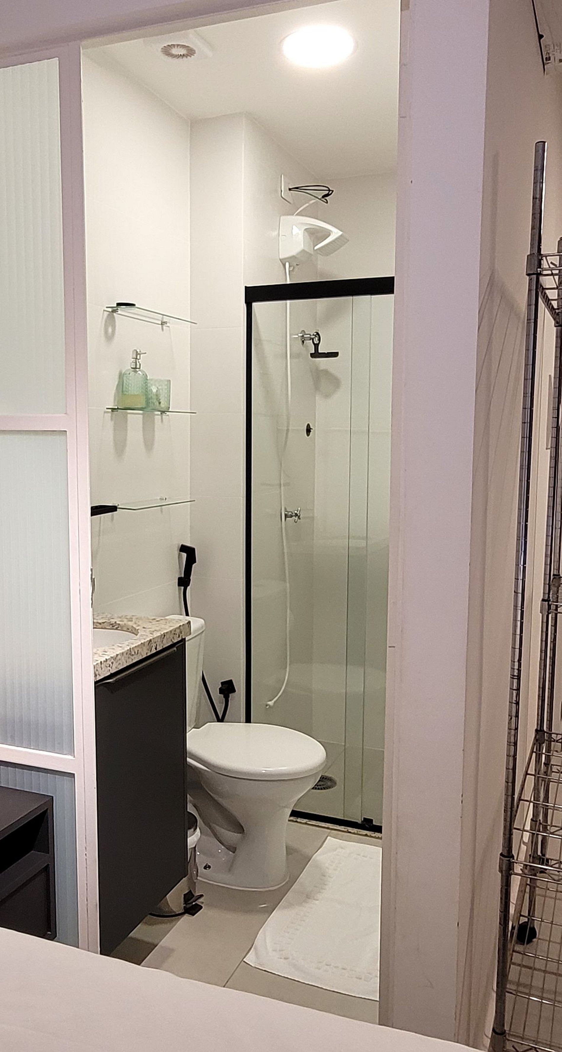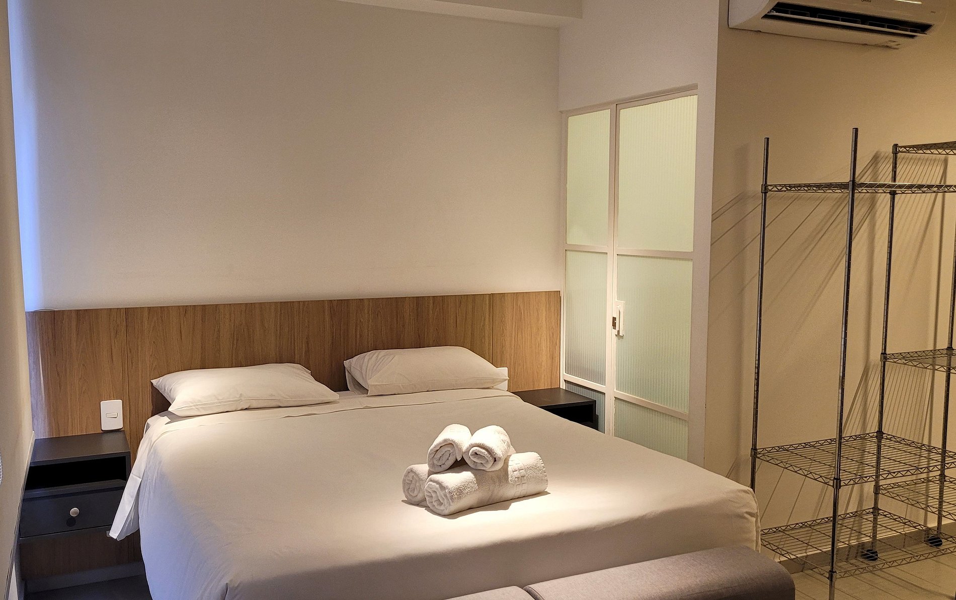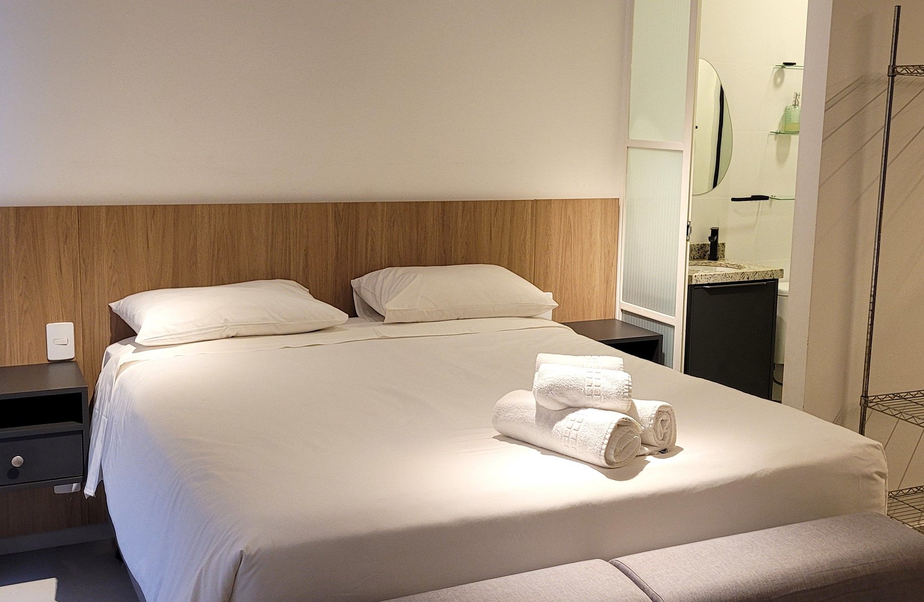 Flat aconchegante, com uma cama Queen, banheiro privativo, cozinha.
