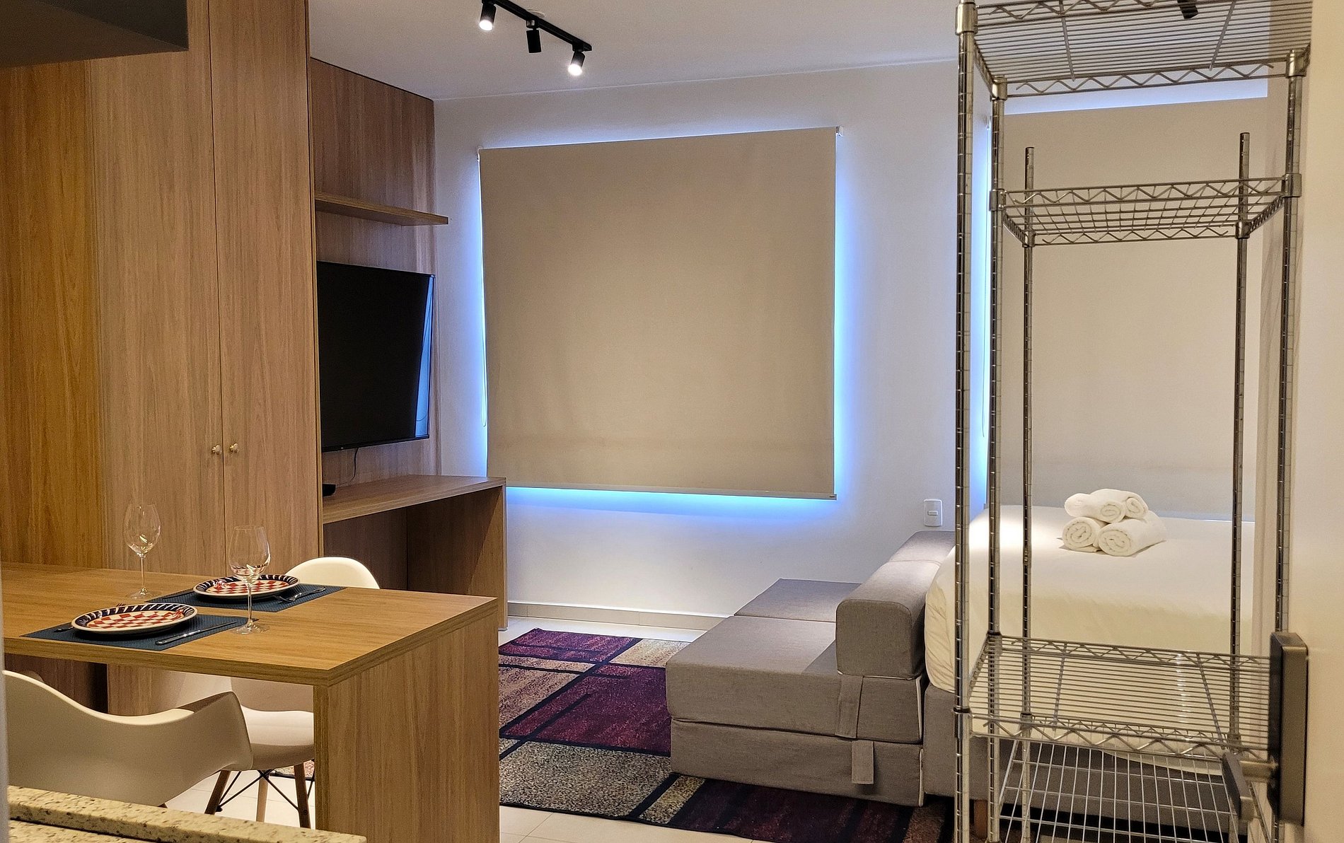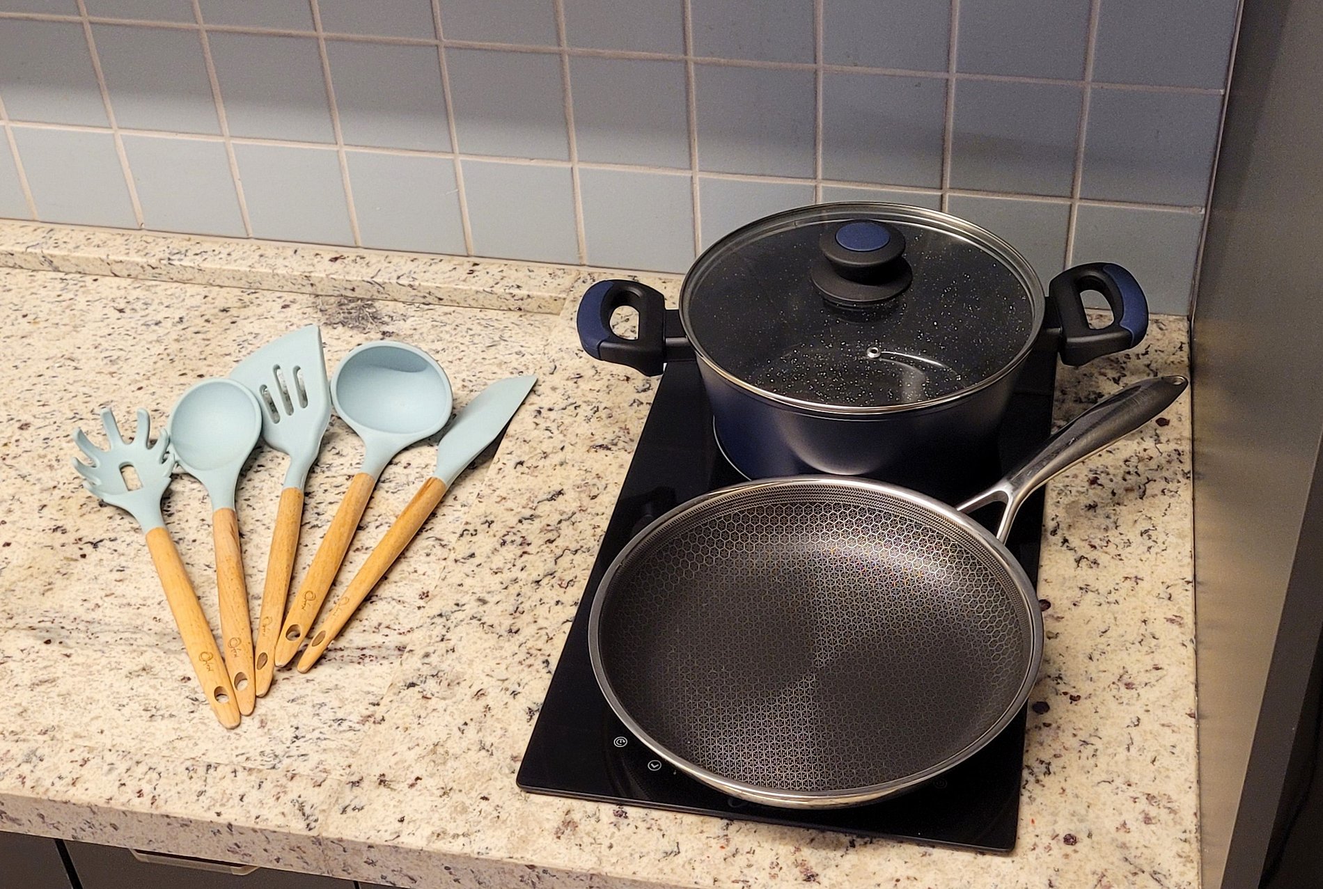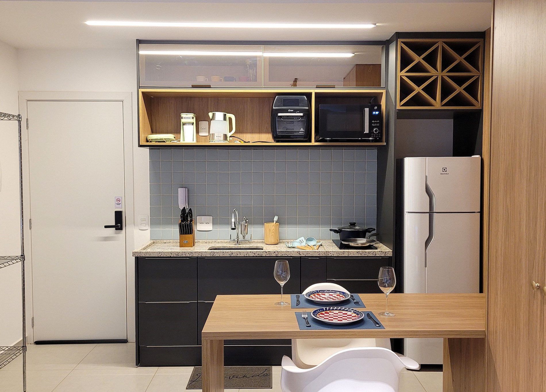 - Cozinha equipada com fogão de indução, micro-ondas, geladeira, pratos, talheres, copos