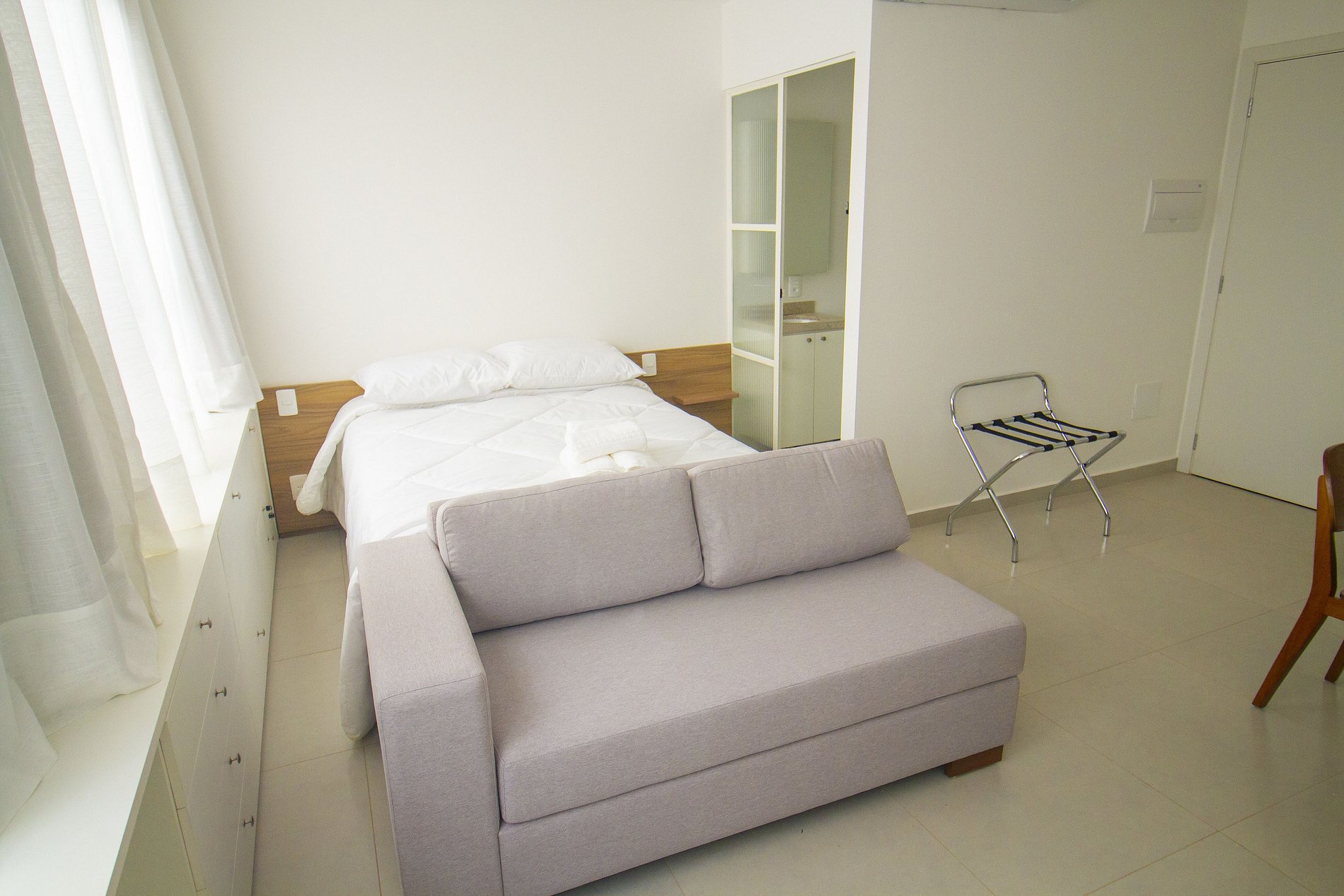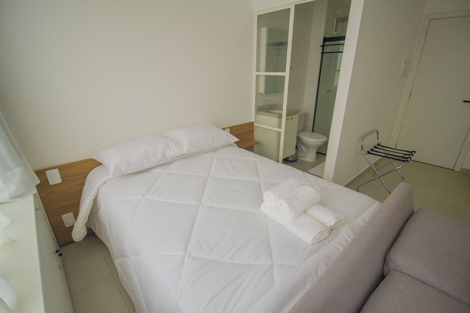 - 1 cama casal e um sofá-cama, que vira a segunda cama de casal (comporta até 4 pessoas)